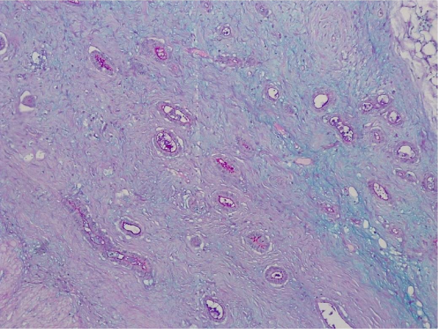 При гистологическом исследовании опухоль тонкого кишечника была представлена тубулярными структурами, построенными из атипичных клеток эпителия, расположенных в один ряд. Многие железистые структуры опухоли содержали муцин (PAS+), проникали в подслизистую, мышечную, серозную оболочки стенки кишки. Обращало внимание развитие десмопластической реакции стромы вокруг опухолевых желез аденокарциномы, представленной миксоматозной рыхлой волокнистой соединительной тканью, содержащей PAS+ вещества.