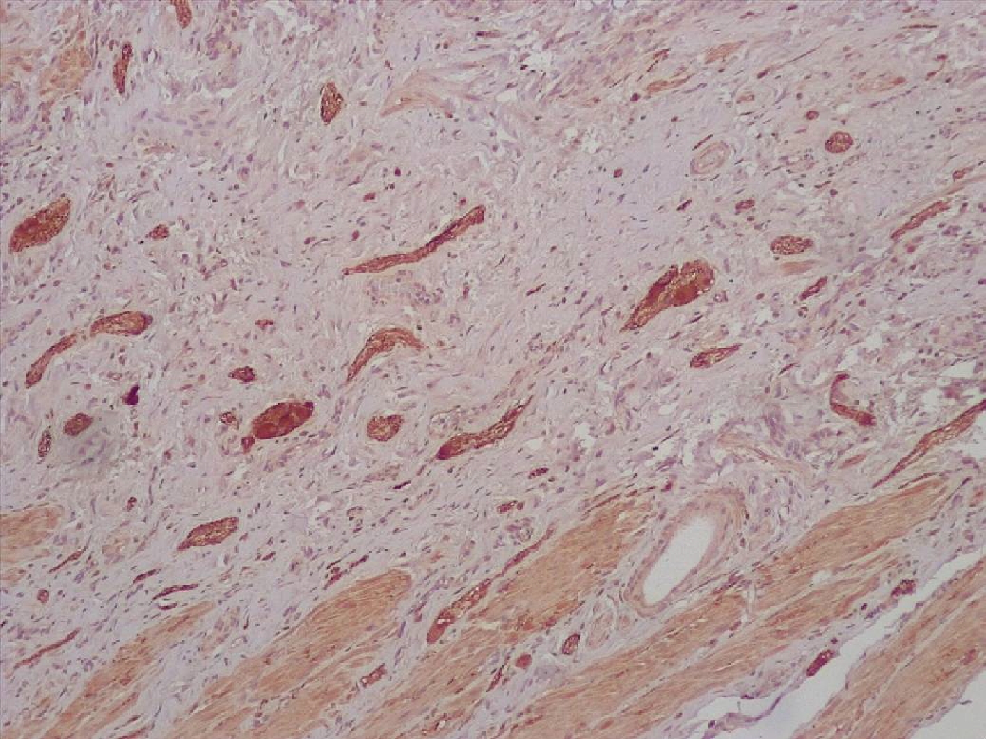 Строма вокруг опухоли была представлена рыхлой волокнистой соединительной тканью с признаками миксоматоза, с немногочисленными тонкими коллагеновыми волокнами, с экспрессией виментина (рис.3).