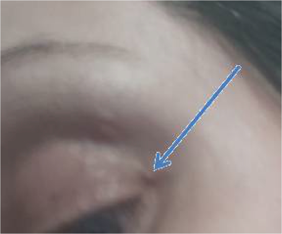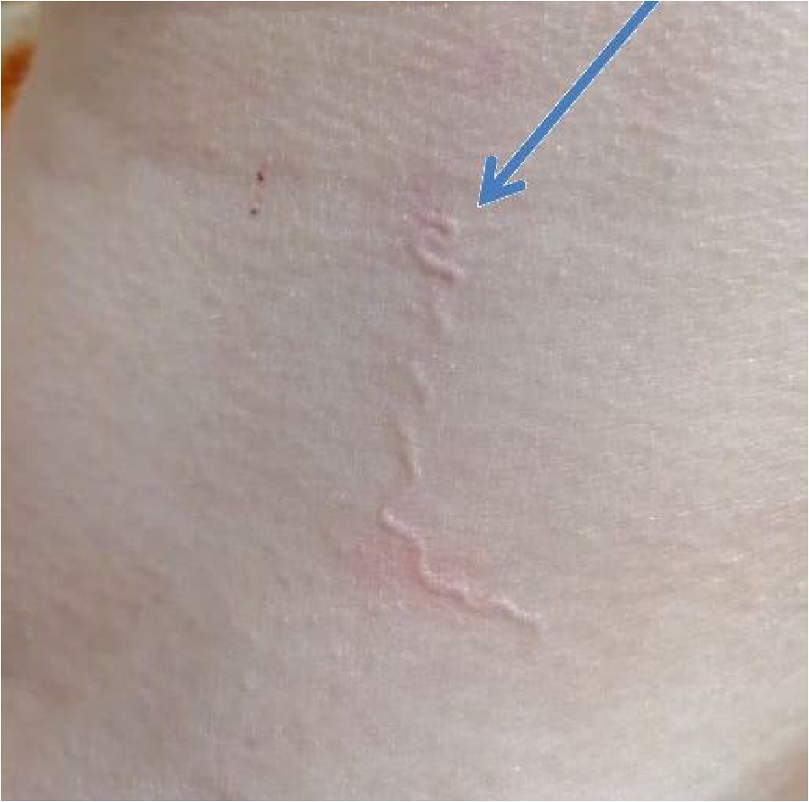 Через полтора месяца, в начале марта над верхним веком справа под кожей появилось извитое болезненное образование. На следующий день - над переносицей, затем исчезло. Через несколько дней появилось опухолевидное образование в области верхнего века левого глаза (фото №1.), пациентка обратилась к офтальмологу. На приеме у врача выяснилось, что данное образование зудит. Были даны рекомендации - антигистаминный препарат. После приема препарата зуд прошел, а опухолевидное образование исчезло. 14.03.2022 на шее появилось подкожное, извитое образование, имеющее четкий контур (фото №2).