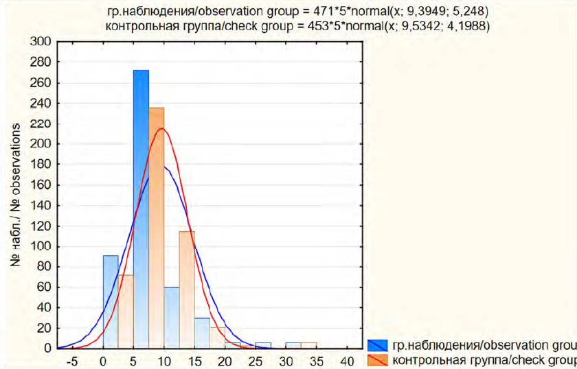Рис. 2. Группировка вариант по продолжительности одного случая пропуска детей в дошкольных организациях по группе наблюдения и контрольной группе