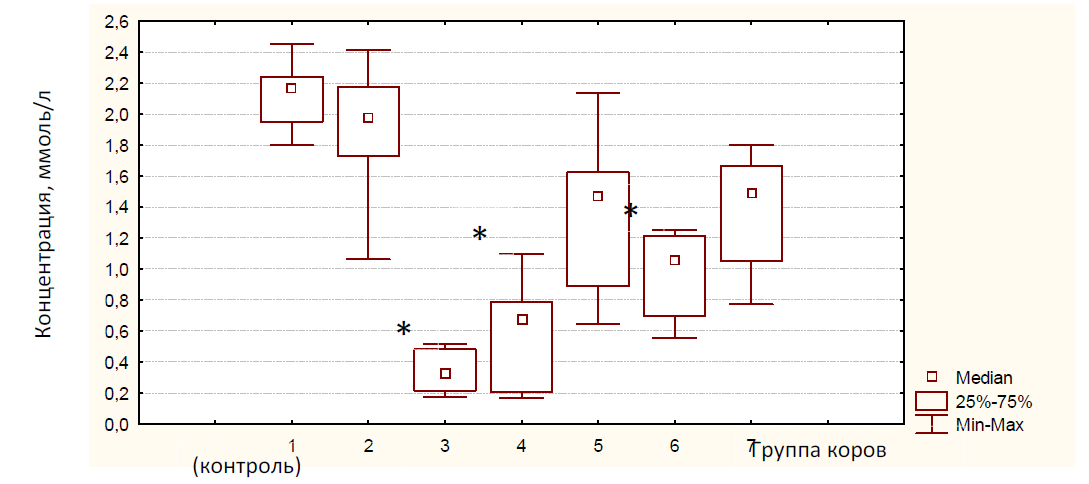 Согласно литературным данным изучения процессов перекисного окисления липидов и состояния антиоксидантной системы у сухостойных и лактирующих коров в динамике предродового и послеродового периодов, показано, что физиологический стресс периода стельности и отела сопровождается повышенным образованием и накоплением продуктов свободнорадикального окисления липидов и низким потенциалом антиоксидантной системы [5].
