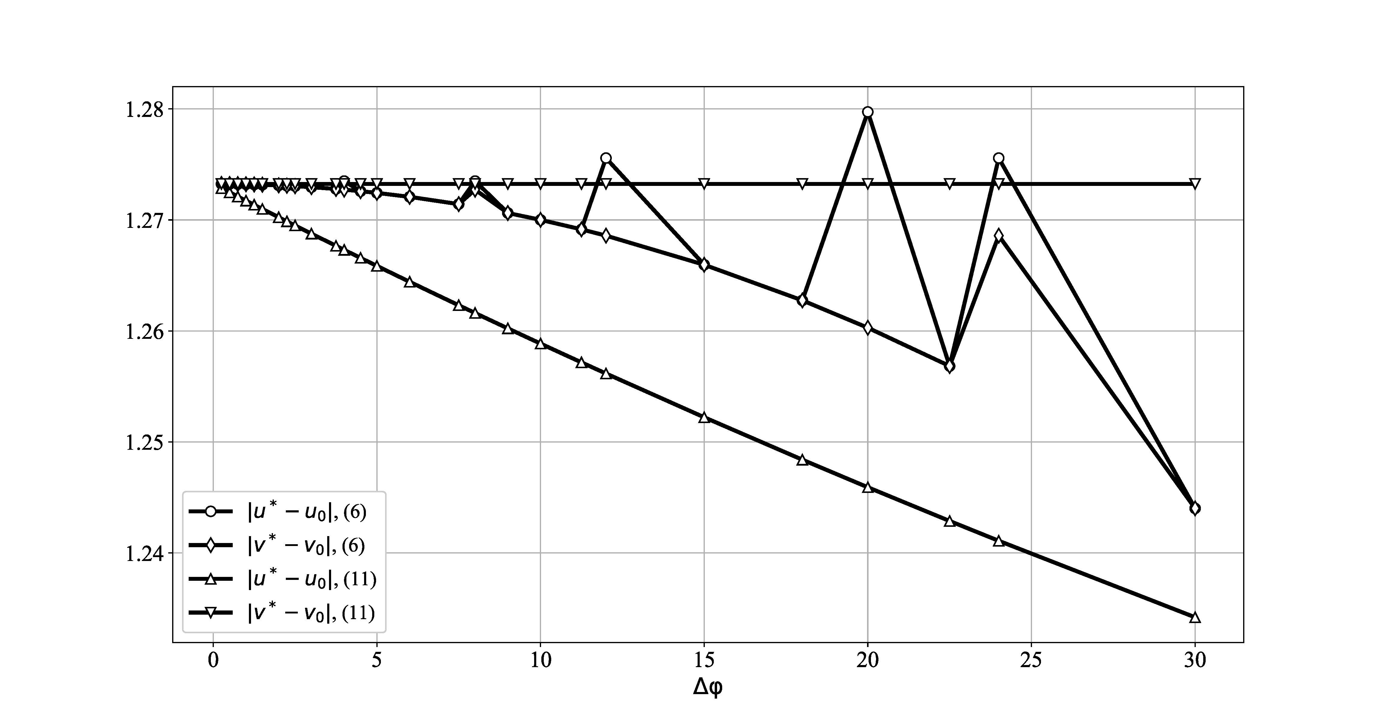 На рис. 2 в качестве иллюстрации показаны зависимости значений коэффициентов при величине в правых частях точных оценок для максимальной ошибки восстановления горизонтальных компонент скорости ветра вида (6) и соответствующих асимптотических оценок вида (11), отмеченных треугольными маркерами, от величины .