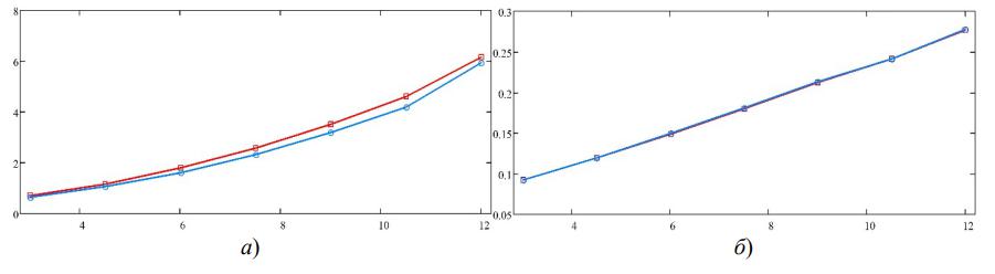 Рис. 4. Зависимость размеров области фокусировки вдоль разных осей от фокусного расстояния Rφ: а) вдоль оси 0X для F1 (красная линия) и F2 (синяя линия), б) вдоль оси 0Y