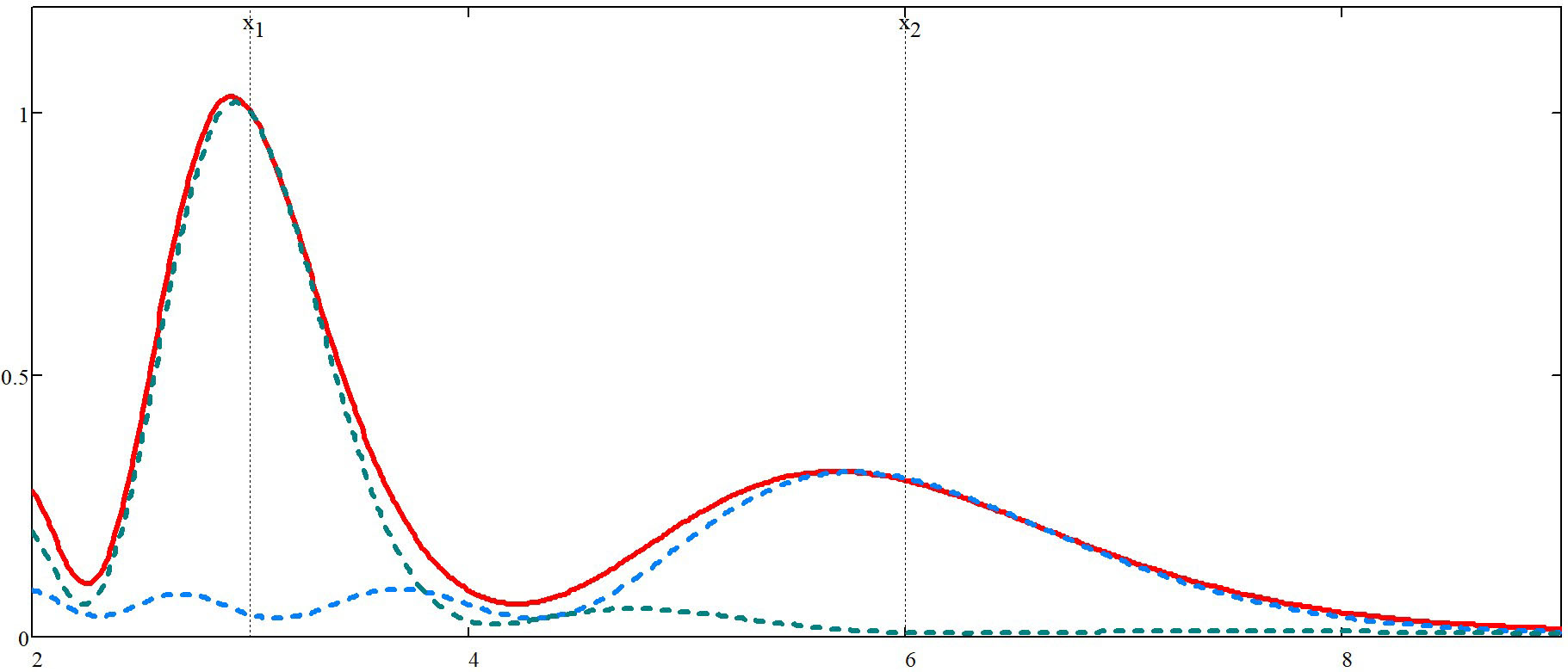 Рассмотрим формирование двух максимумов энергии электромагнитного поля, сформированных на одной прямой вдоль направления излучения. На рисунке 7 представлено распределение энергии электромагнитного поля в продольном направлении, сфокусированного в точках х1 = 3 м и х2 = 6 м, синим цветом обозначено поле на частоте f2, зеленым цветом — поле на частоте f1 и красным — суммарное распределение поля в заданной области.