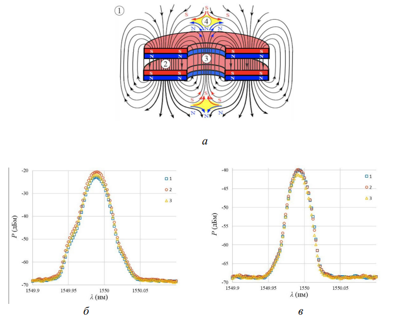 Полость, заполненная ЖК, помещалась в область однородного магнитного поля, создаваемого двумя соосно расположенными постоянными кольцевыми магнитами 4 (рис. 2а). Магниты (внешний диаметр 25 мм, внутренний – 10 мм, высота 2 мм) были зафиксированы в оснастке на расстоянии 3 мм друг от друга. Картина силовых линий магнитного поля для данной конструкции приведена на рис. 3а. Известно, что в центре системы существует зона однородного магнитного поля в виде цилиндра, в которой величина неоднородности не превышает 2 % [17]. В работе для системы используемых магнитов была измерена индукция магнитного поля тесламетром с помощью датчика Холла. Рассчитаны значения напряженности магнитного поля Н для точек, обозначенных на рис. 3а, которые равны Н2= 191 кА/м, Н3= 159 кА/м, Н4=29,5 кА/м.