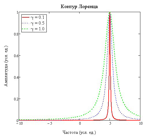 С уменьшением γ резонансный контур, описываемый лоренцевской кривой, становится уже, рисунок