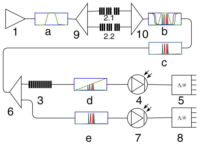 На рисунке Рис. 7 приведена оптико-электронная схема опроса двух А‑ВБР структур, где использованы обозначения: 1 – лазерный источник с частотой излучения эквивалентной диапазону изменения оптических частот; 6, 9 – оптоволоконные разветвители и 10 – объединитель мощности; 2.1 и 2.2 – А‑ВБР датчики; 3 – фильтр с наклонной АЧХ; 4, 7 – измерительный и опорный фотоприемники; 5, 8 – измерительный и опорный АЦП.