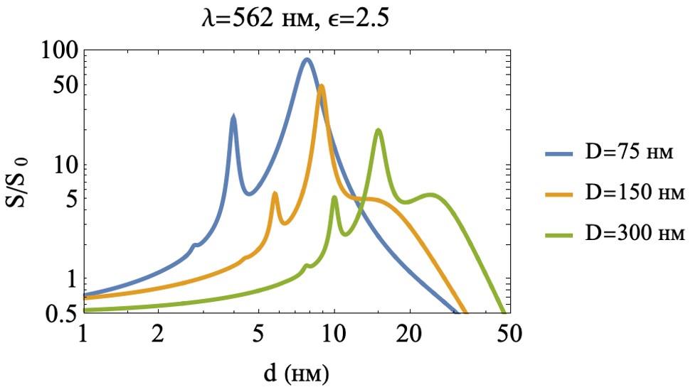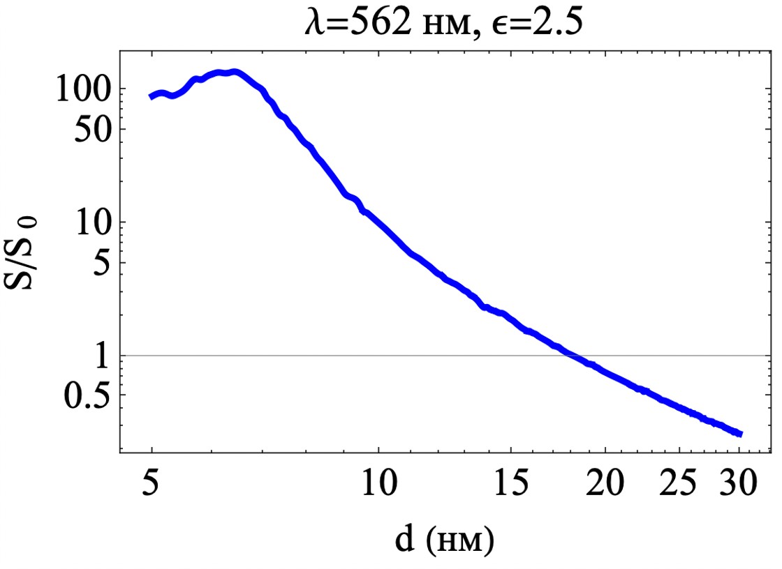 Для расчета усиления излучения от пластиковой микросферы в металлической оболочке воспользуемся простой моделью, в которой излучающий электрический диполь помещен внутри диэлектрической сферы радиуса 300 нм с показателем преломления 1.58 (соответствует показателю преломления полистирола [14]), которая расположена на гладком оптически непрозрачном слое серебра и покрыта серебряной наношляпкой. Поскольку процесс комбинационного рассеяния является некогерентным, мы можем рассматривать только один диполь в оболочке. Расстояние от диполя до серебряной оболочки выбрано 1 нм. Электрические поля колеблющегося электрического точечного диполя в металлической оболочке были получены в программе COMSOL, которая решает полную систему уравнений Максвелла методом конечных элементов. Компоненты электрических полей рассчитывались с металлической оболочкой и без нее, соответственно, во всей области моделирования. Идеально согласованные слои (PML) использовались для моделирования бесконечных областей. Рассчитано усиление плотности потока энергии электромагнитного поля S, излучаемого диполем, расположенным вблизи сферической серебряной оболочки на расстоянии 1 нм от ее внутренней поверхности, по отношению к плотности потока энергии электромагнитного поля , излучаемого диполем в вакууме. Усиление излучения в зависимости от толщины серебряной оболочки d при фиксированной длине волны 562 нм показано на Рис. 1, Рис. 2. Рассмотрен случай, когда диэлектрическая сфера касается гладкой оптически не прозрачной поверхности серебра (Рис. 3, Рис. 4.), а также случай, когда оболочка частично покрывает сферу и имеет форму “шляпки” — занимает половину ее площади (Рис. 5, Рис. 6.) и четверть площади (Рис. 7, Рис. 8).