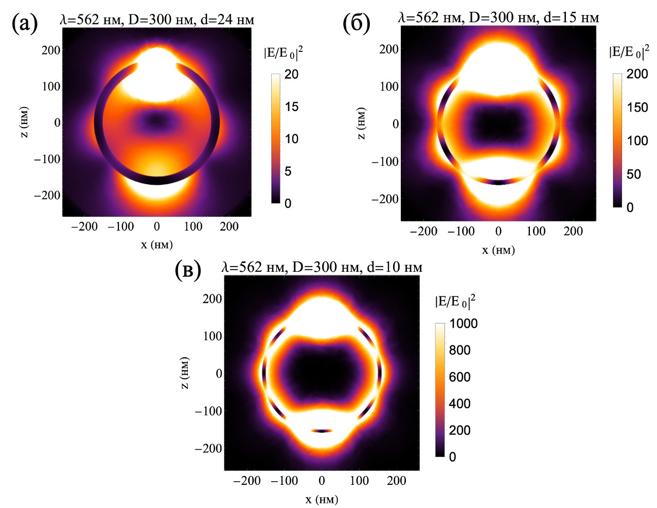Рис. 2. Усиление излучения S/S0 диполя, расположенного в верхней части серебряной оболочки на расстоянии 1 нм от оболочки при резонансной толщине оболочки: (а) 24 нм; (б) 15 нм; (в) 10 нм