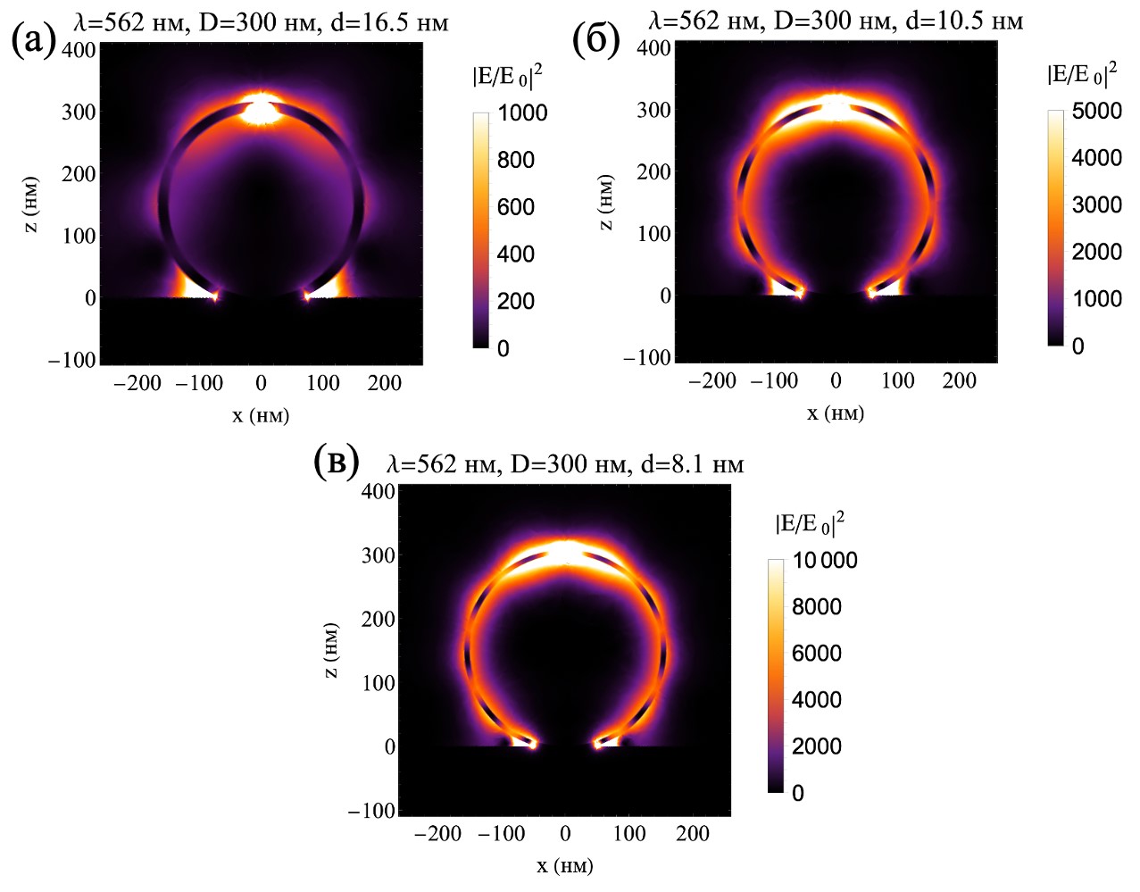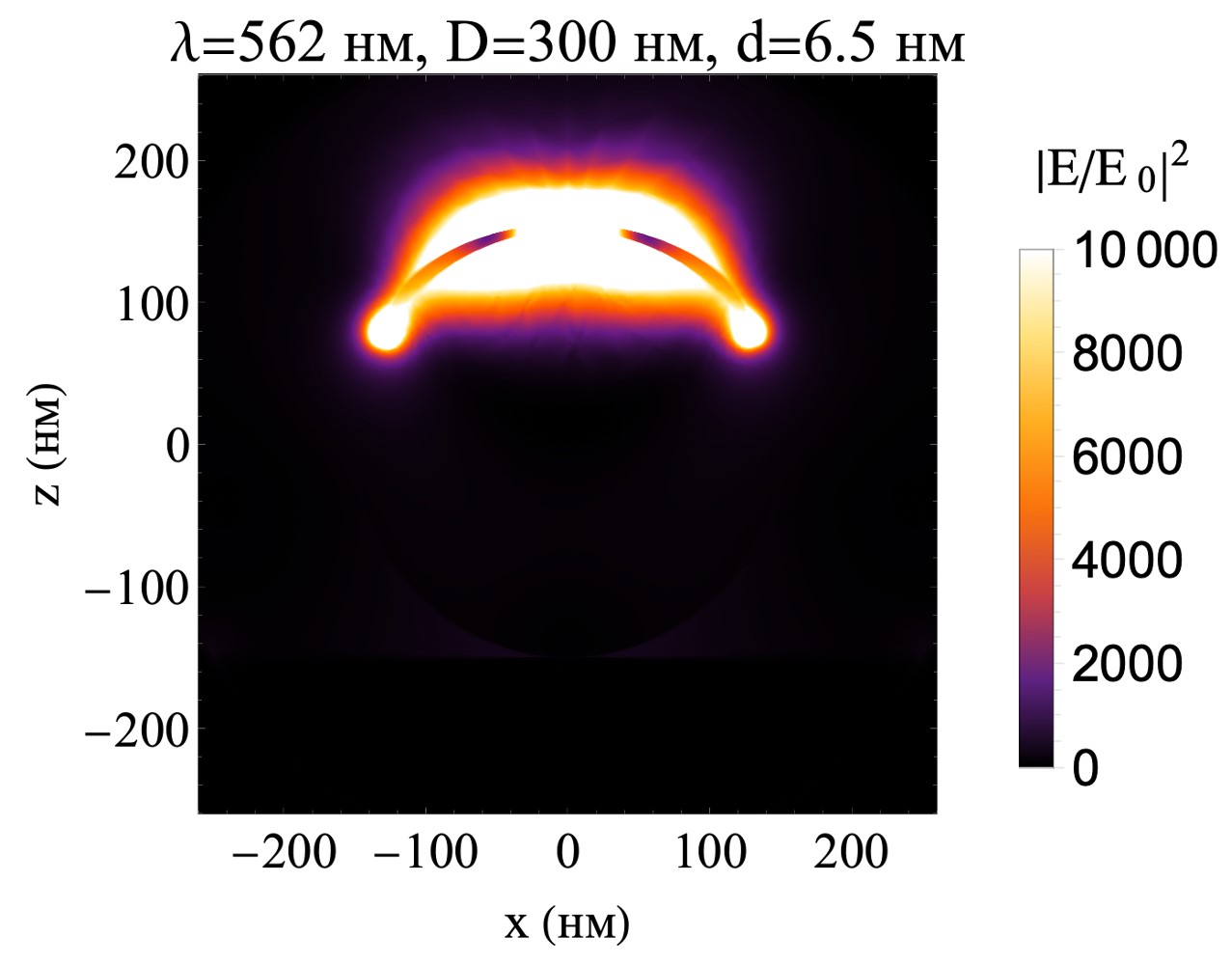В этом случае поле сосредоточенно преимущественно в интерфейсе «серебро-пластик». Стоит отметить, что серебряная нанопленка толщиной менее 10 нм, полученная путем электронно-лучевого испарения в вакууме, может иметь островковую структуру, которая содержит кластеры серебра разного размера. В таком случае размер кластеров и расстояние между ними будет определять величину поля, возбуждаемого этими кластерами.