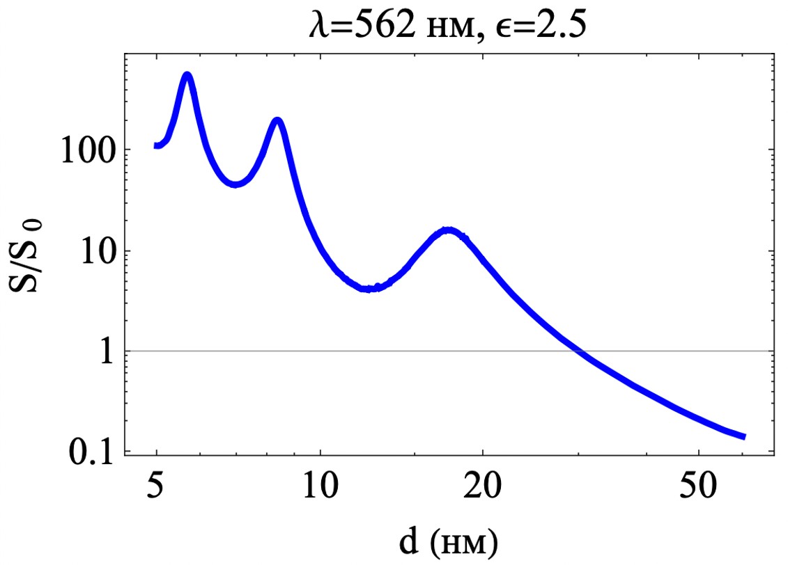 Рис. 5. Усиление излучения S/S0 диполя, расположенного в верхней части серебряной шляпки на расстоянии 1 нм от нее в зависимости от толщины серебра. Шляпка покрывает половину площади пластиковой сферы