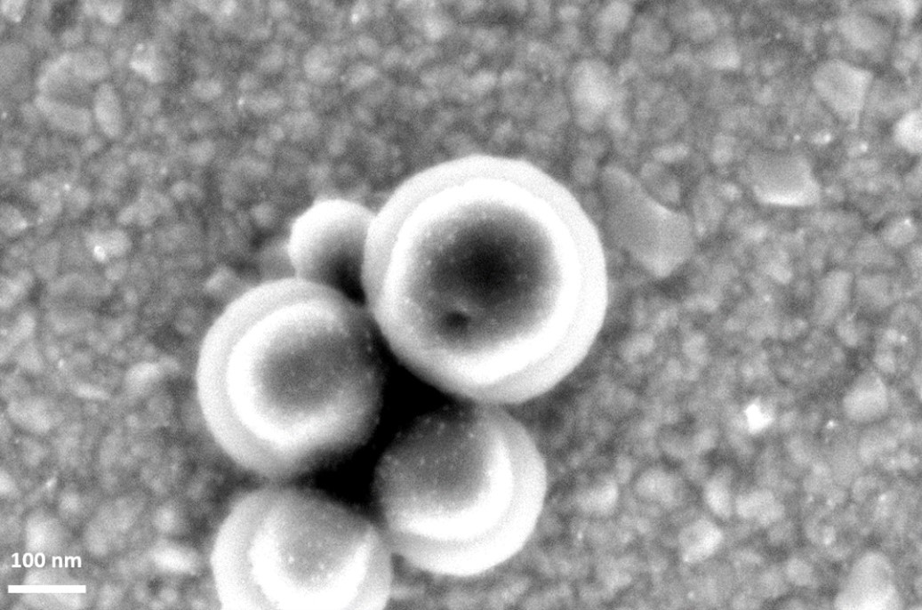 Рассчитывалось среднее поверхностное значение S/S0 по нормали к поверхности сферы. Видно, что излучение S/S0 резонансно усиливается при реальной толщине серебра порядка 20 нм. Предполагается, что длина волны 562 нм является длиной волны излучения, т.е. вторичного излучения при стоксовом сдвиге см относительно длины волны накачки 532 нм (зеленый лазер, используемый в спектроскопии КР). Излучение диполя частично отражается металлической оболочкой и возбуждает поверхностные плазмоны. Плазмонное излучение отражается сферой обратно и частично выходит за пределы металлической оболочки. Электрическое поле резонансно возрастает при уменьшении толщины серебра и распространяется по всей поверхности полусферы. Интерес представляет случай, который соответствует реальному эксперименту – когда серебряная оболочка частично покрывает сферу. Изображение пластиковых микросфер диаметром 300 нм и покрытых нанослоем серебра толщиной 20 нм, полученное с помощью сканирующей-электронной микроскопии (СЭМ), представлено на Рис. 9. Для получения изображения микросфер с высоким увеличением использовался растровый электронный микроскоп Zeiss Merlin (Carl Zeiss AG, Германия). Микроскоп оснащен полевым катодом Шоттки и электронной оптикой GEMINI II. Изображения получали при ускоряющем напряжении 2 кВ (EHT), токе зонда 70 пА, увеличении 245 x103 , рабочем расстоянии 2.1 мм, в режиме высокого разрешения колоны и с помощью внутрилинзового детектора электронов.