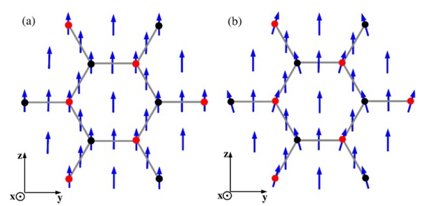 Рисунок 1 – Схематическое изображение образца графена на ферромагнитной подложке. Ориентация осей показана в левом нижнем углу. Начало координат находится в центре правильного шестиугольника. Атомы углерода графена представлены черными (подрешетка B) и красными (подрешетка A) кругами. Сплошные (серые) линии, соединяющие атомы, показывают углерод-углеродные химические связи. Под графеном находится ферромагнитная подложка. Синие стрелки представляют локальную намагниченность на поверхности ферромагнетика. Панель (a) соответствует случаю идеальной намагниченности, см. уравнение (11). Панель (b) представляет состояние с подкосом. В этом случае проекция намагниченности M, периодически изменяется в пространстве, см. уравнения (16) и (17). Мы рассматриваем только те деформации подкоса, для которых M, имеет противоположные знаки под атомами, принадлежащими разным подрешеткам, в соответствии с условием (17). Легко заметить на панели (b), что под атомами подрешетки A, и для подрешетки B