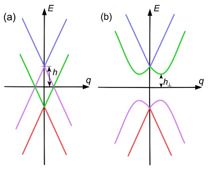 Рисунок 2 – Схематическое изображение электронной дисперсии для графена на ферромагнитной подложке. Горизонтальная ось соответствует абсолютной величине волнового вектора. Вертикальная ось соответствует энергии. Начало координат соответствует точке Дирака (спектры вблизи обеих точек Дирака идентичны). Для электронных состояний со спином () вершина конуса Дирака смещена на h (смещена на -h). Дисперсия для идеально однородной намагниченности представлена на панели (a). Зона, показанная синей (красной) линией, полностью пуста (заполнена). Лиловая и зеленая линии соответствуют зонам, пересекающим уровень Ферми. Эти зоны образуют электронную и дырочную поверхности Ферми. На панели (а) электронная и дырочная поверхности Ферми совпадают, демонстрируя идеальный нестинг. Диэлектрическое состояние с подкосом намагниченности представлено на панели (b). Заполненные зоны (красная и лиловая кривые) образованы смешанными состояниями, полученными в результате гибридизации электронных и дырочных состояний. Пустые зоны показаны зеленым и синим цветом. Спектр имеет щель