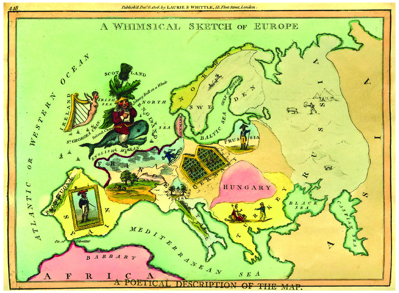 Россия: «западно-восточные» идентичности в сатирическом «измерении». Британская карта эпохи наполеоновских войн даёт нам образ Европы, слабо «населённой» изображениями представителей разных государств. И это притом, что в журнальной карикатуре, пропагандистских листках и лубке образы монархов как непременных участников европейских коллизий прочно заняли своё место ещё в XVIII в.34
