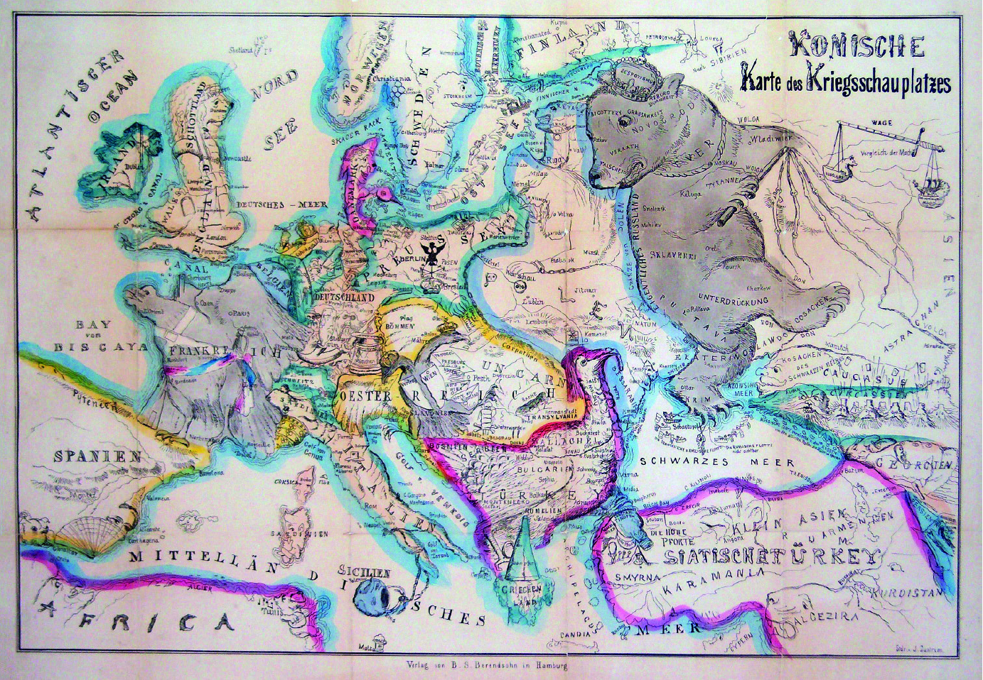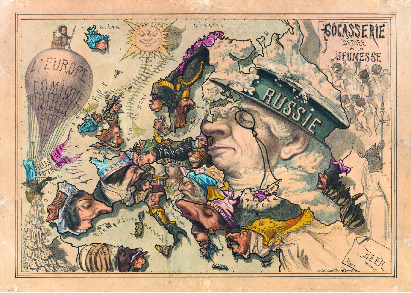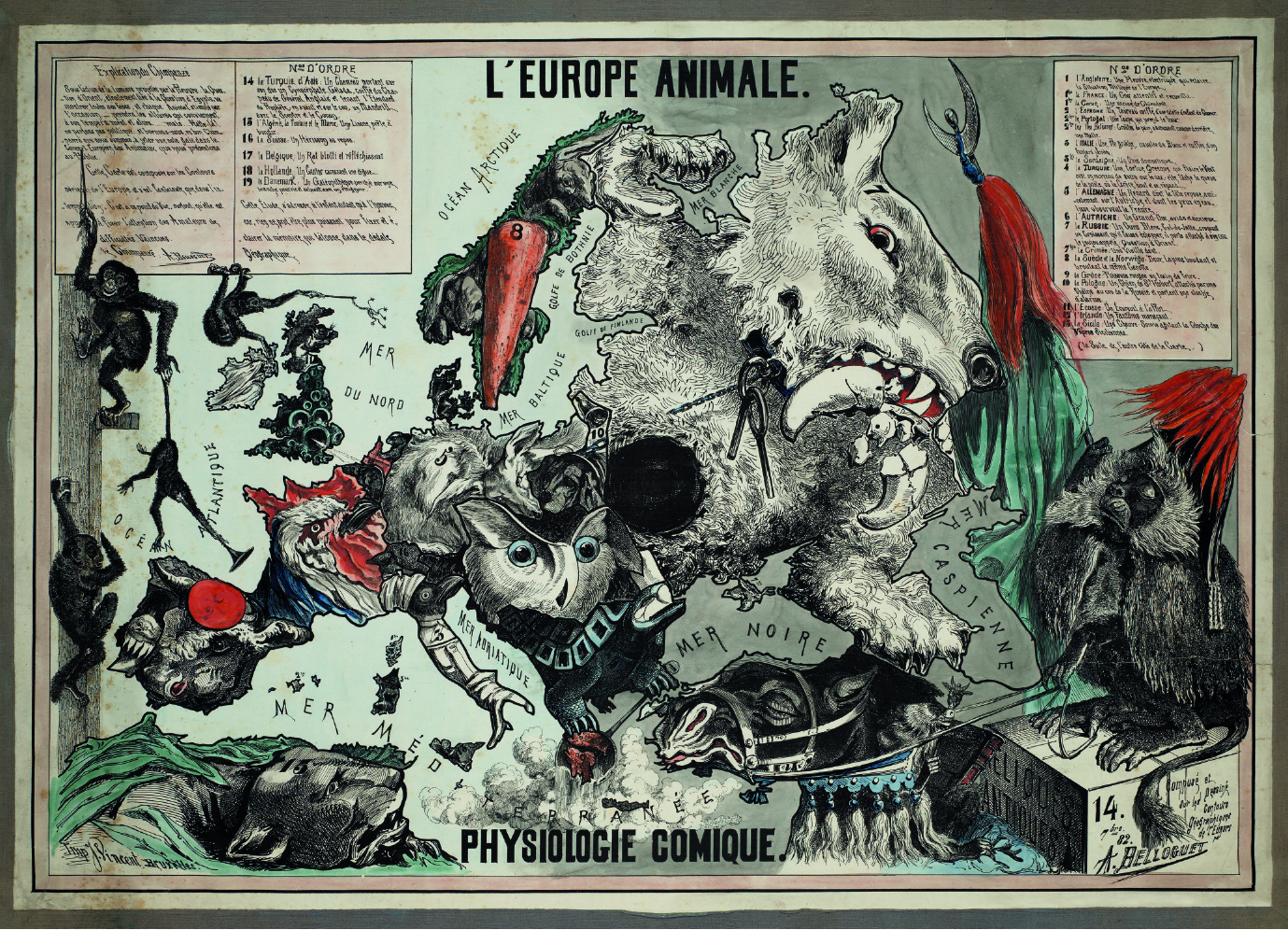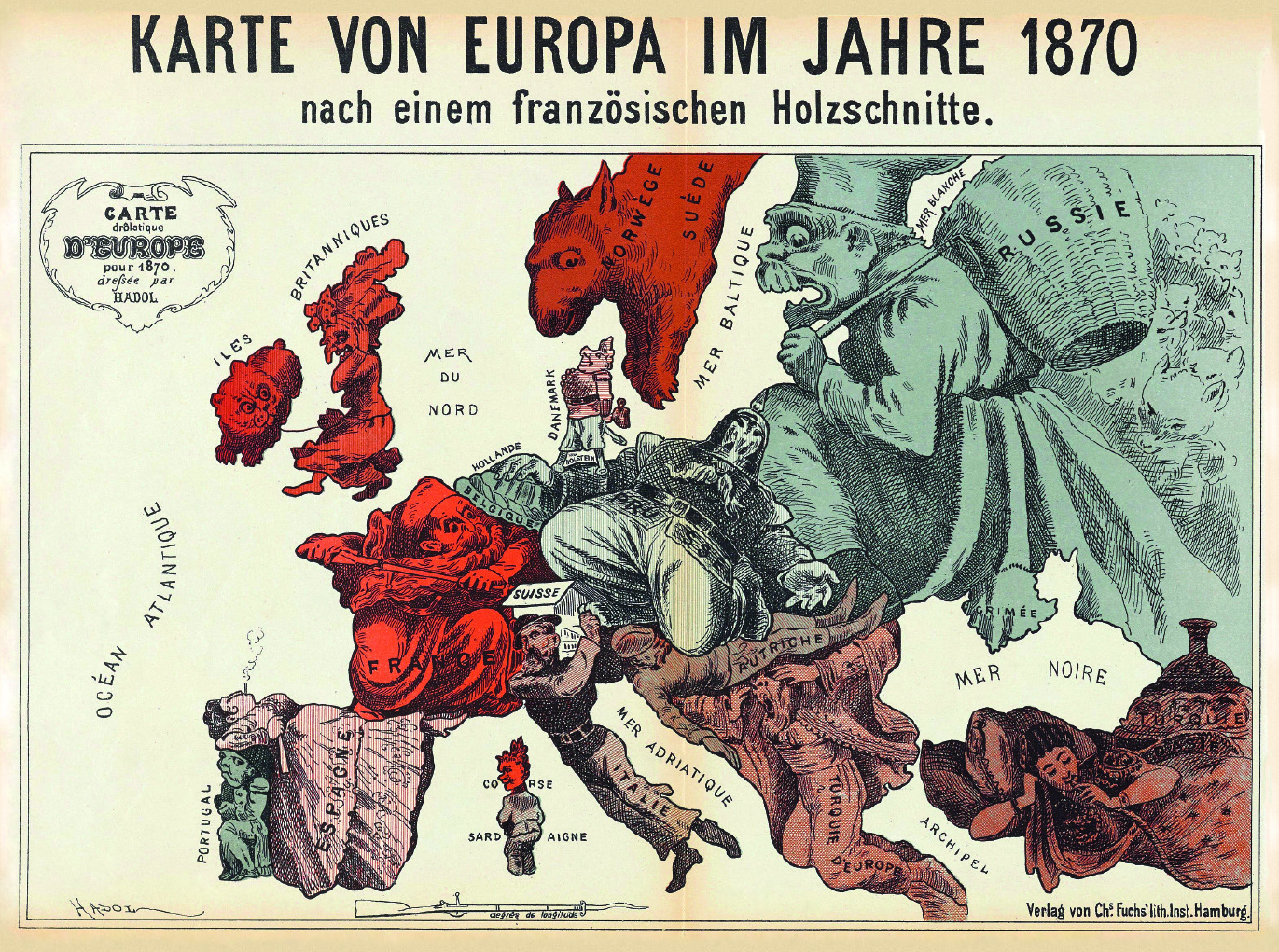 Нарастание напряжённости на континенте в начале 1870-х гг. породило всплеск гротескно-шаржированного изображения европейских страстей в «географическом измерении». Характерный пример – «Сатирическая карта новой Европы 1870 г.», созданная накануне франко-прусской войны известным французским художником Полем Гадолем. Она даёт довольно неприглядную картину роста взаимных политических фобий в «концерте» европейских держав. На ней в целом бесполезно искать «правых» и «виноватых». И озлобленный солдат-бородач француз, и раздувшийся от внешнеполитических амбиций пруссак, и зажатая между политическими амбициями соседей Бельгия, и пытающаяся удержать Ирландию Британия, и скандинавские страны, готовые к прыжку на континент, и обособившаяся в своём нейтралитете Швейцария («дом без окон и дверей»), и Османская империя, в духе ориенталистской трактовки разделившаяся на восточную пассивную «женскую ипостась» и европейскую активную (оскаленный «янычар»). Большинство этих образов полны настроений нескрываемой угрозы или страха и свидетельствуют о взаимной неприязни и растущем недоверии.