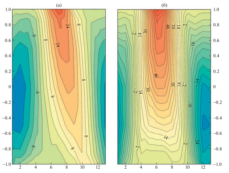 Рис. 1. Аномалии инсоляции на ВГА (Вт/м2) для 6 (а) и 127 (б) тыс л. н. На оси абсцисс – номера месяцев, на оси ординат – синус широты (Южное полушарие <0). Расчеты проведены на основе алгоритмов и программ, представленных в (Berger, 1978). Fig. 1. Insolation anomalies on the MAA (W/m2 ) for (a) 6 and (б) 127 kyr ago. On the abscissa axis, the numbers of the months, on the ordinate axis, the sine of latitude (Southern Hemisphere <0). The calculations were carried out on the basis of the algorithms and programs presented (Berger, 1978)