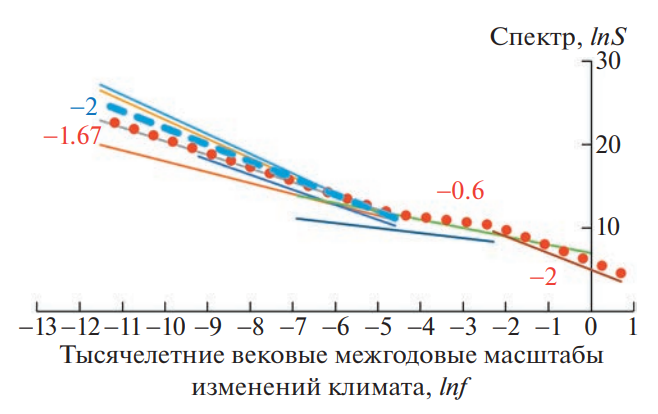 Поведение обобщающей линии в высокочастотном диапазоне близко к закону (1) с , а в низкочастотной области проведены две ветви с k = 1.67 ≈ –5/3 и k = –2. Эти значения дают основания предполагать, что поведение климатической изменчивости определяется колмогоровским каскадным процессом ( k = –5/3) и броуновским движением ( k = –2). В промежуточной области “вековых” колебаний климата величина существенно меньше (–0.6), что подчеркивает то, что формирование климатической изменчивости имеет разный генезис на разных частотах.