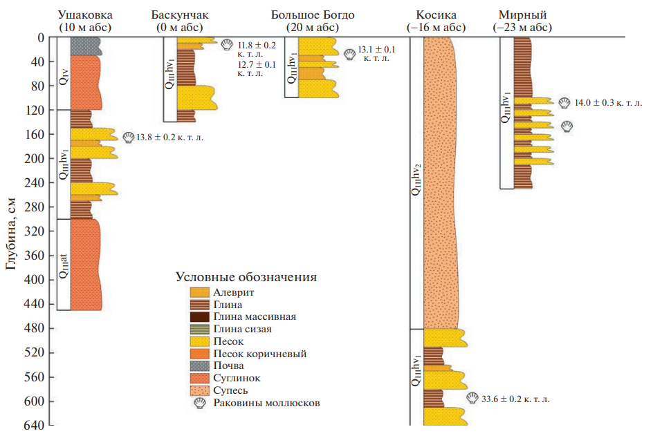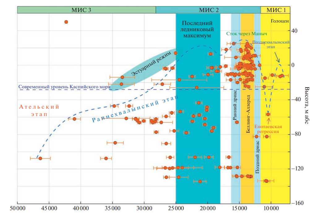 Колебания уровня Каспийского моря на ранне- и позднехвалынском этапах. Ательский регрессивный этап оценивается падением уровня Каспийского моря от –50 до –140 м абс. (Леонтьев и др., 1977; Лохин, Маев, 1990) и накоплением серии разногенетических типов отложений – лёссов, аллювиальных песков, озерных отложений на прилегающих к бассейну территориях. Их возраст по данным термолюминесцентного и ОСЛ датирования оценивается между 80–20 тыс. л. (Шаховец, 1987; Янина и др., 2017; Kurbanov et al., 2021, Taratunina et al., 2022). По данным радиоуглеродного датирования начальный этап подъема уровня Каспийского моря, отвечающего раннехвалынской трансгрессии, приходился на временной промежуток 45–30 кал. тыс. л., а уровень бассейна располагался в интервале –110…–50 м абс. ( рис. 5 ). Результаты литологического строения керна многочисленных скважин из Северного Каспия, подтверждают последовательную смену фациальных разностей, отвечающих трансгрессивному режиму Каспия (Безродных и др., 2015; Yanina et al., 2018) ( рис. 3 ). Отложения данной фазы трансгрессии представлены раннехвалынскими видами Didacna subcatillus, Didacna zhukovi, D. parallela.