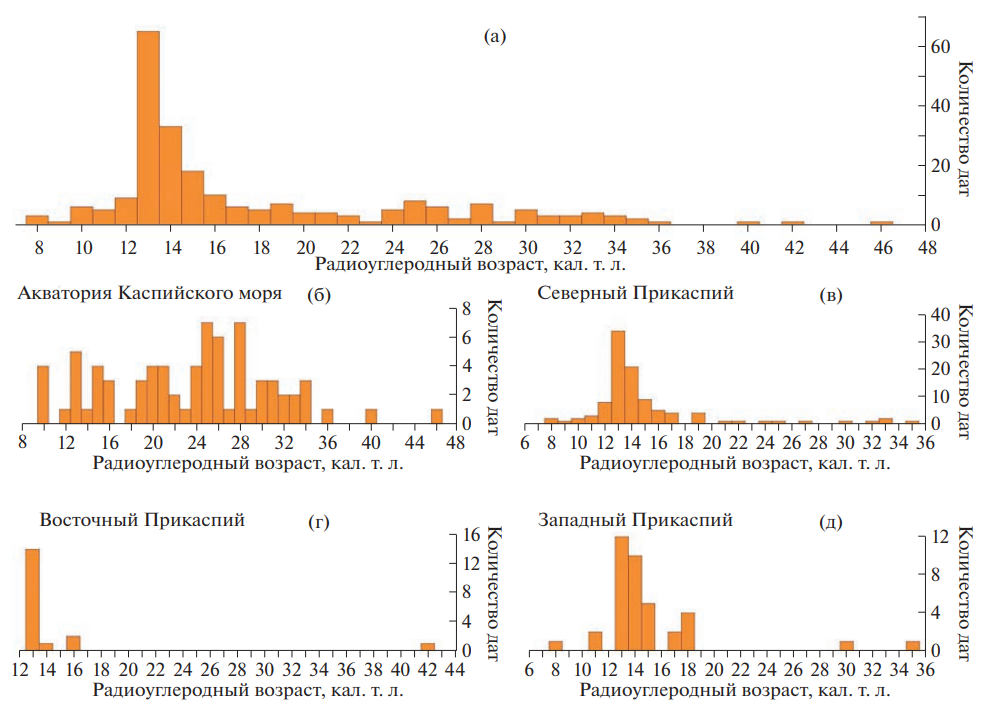 Рис. 4. Радиоуглеродные даты хвалынских отложений. Количество дат: (а) – общее для Каспийского региона, (б) – для акватории Каспийского моря, (в) – для Северного Прикаспия, (г) – для Восточного Прикаспия, (д) – для Западного Прикаспия. Fig. 4 . Radiocarbon dates of Khvalynian deposits. Number of dates: (a) – common for the Caspian region, (б) – for the Caspian Sea area, (в) – for the Northern Caspian Sea, (г) – for the Eastern Caspian Region, (д) – for the Western Caspian Sea.
