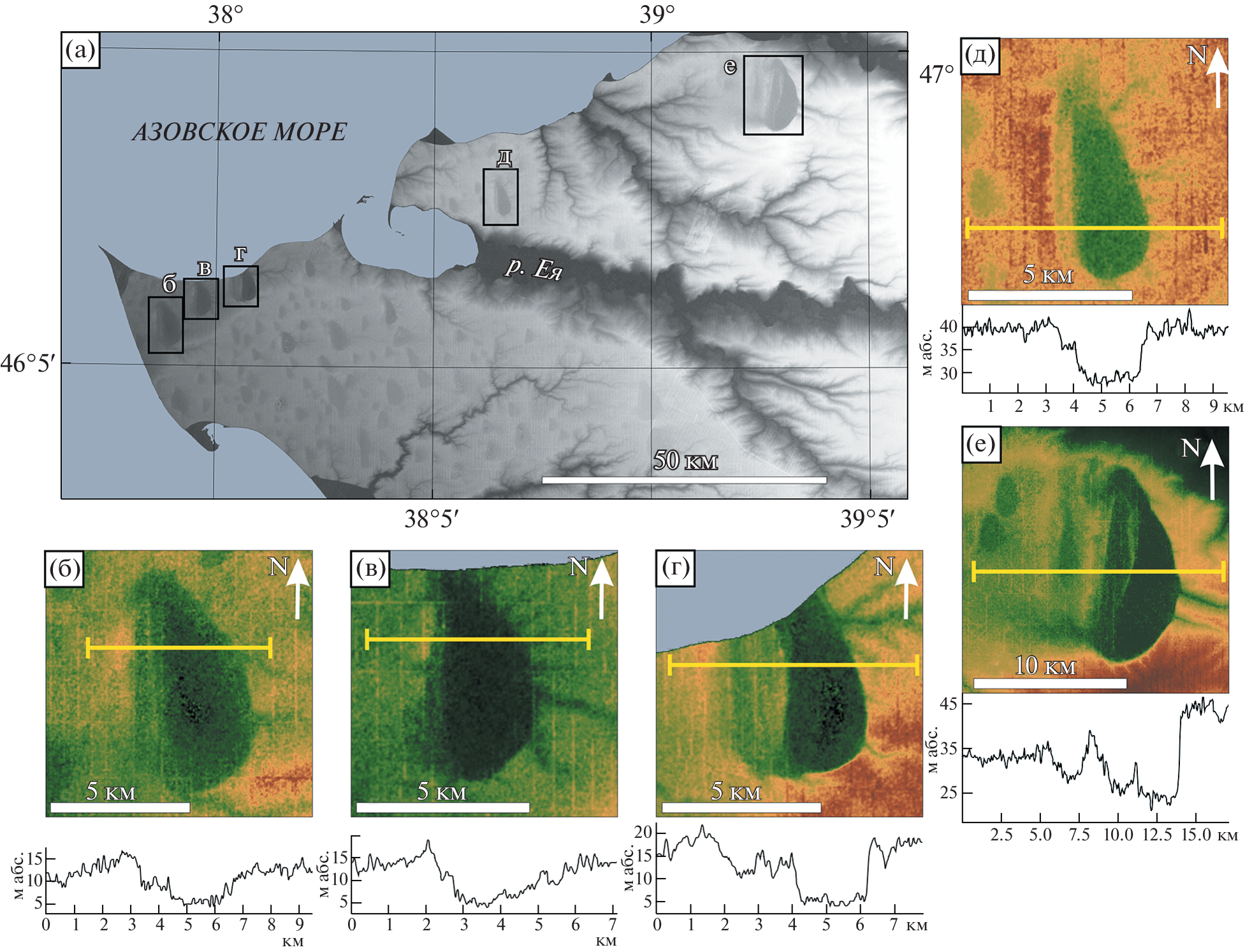 Рис. 3. Топография крупнейших западин ареала 3. (а) – обзорная карта, (б) – падь Крикунова, (в) – Червоная падь, (г) – Воронцовская падь, (д) – Лиман Большой, (е) – Кугейская падь. Fig. 3 . Topography of the largest oriented depressions of the site 3. (а) – overview map, (б) – Pad’ Krikunova, (в) – Chervonaya Pad’, (г) – Vorontsovskaya Pad’, (д) – Liman Bol’shoy, (е) – Kugeiskaya Pad’.