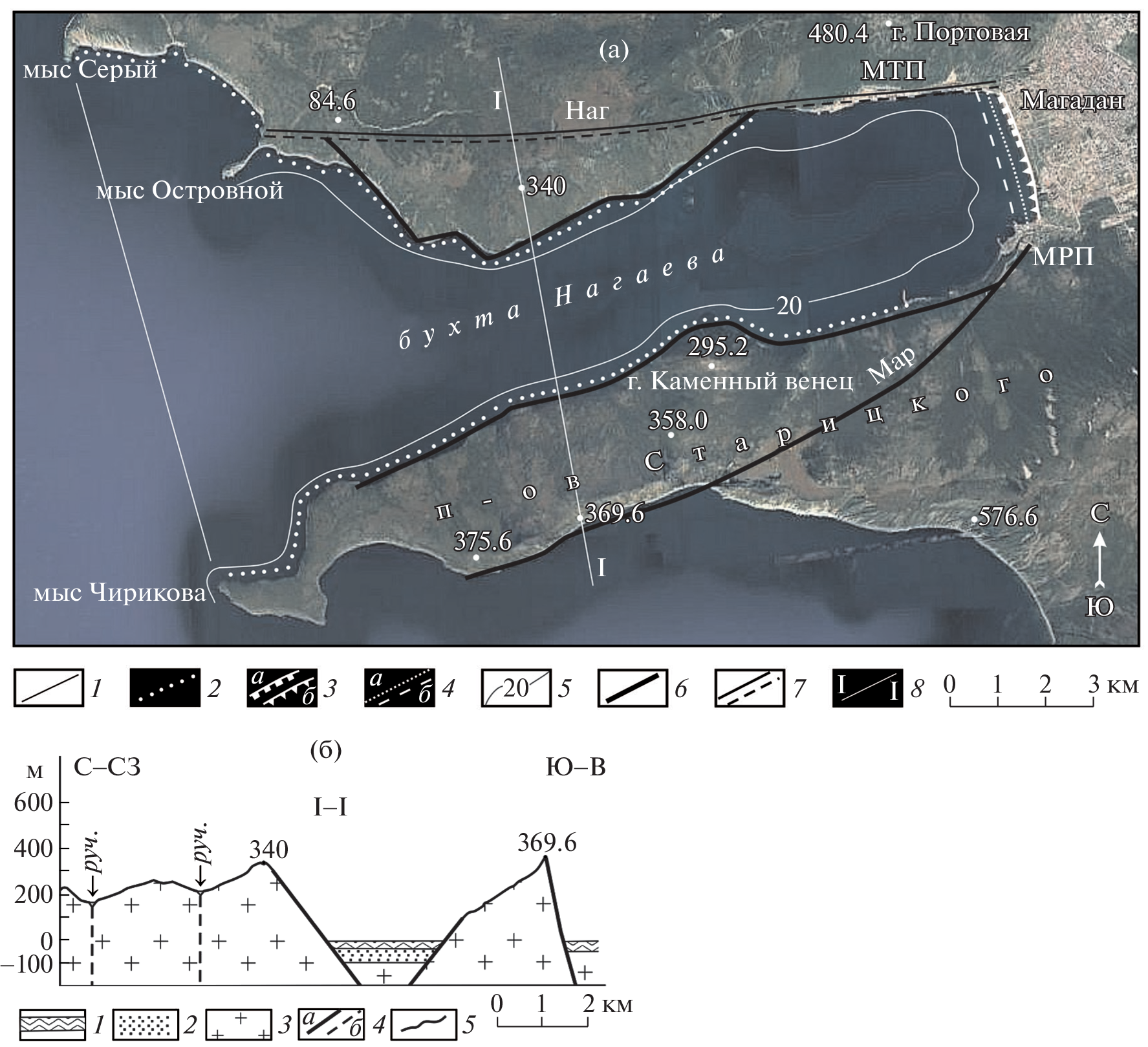 The results of the morphodynamics analysis of denudation slopes and the coastal zone of Nagaev Bay, as well as estimated distances and rate of the eastern coastline retreat for the period from 1939 to 2016 are presented. The main methods of the work are morphographic and morphometric using aerial photographs of different years of flight, modern satellite images and snapshots. It is established that the morphostructure of the southern and northern shores of Nagaev Bay is determined by active faults striking in sub-latitudinal direction and framing the bay. The polygenetic mountain slopes adjacent to the coastline differ in length and angle of inclination. The slopes are covered with active kurums (stone runs) that slide towards the bay. In the lower part of the northern slope there is a zone of the Nagaevsky active fault, which causes a high dynamics of slope processes with a predominance of active kurums and landslides. The northern slope has been cut by a road built during the construction of the seaport and the Port Highway. As a result, widespread technogenically triggered landslides, rock falls and scree are often disrupting traffic on the highway. Thus, the territory of the commercial seaport and the Port Highway are at a risk of a sudden movement of large-volume of detrital material down the mountain slope. The eastern coastal zone is formed by a coastal ledge composed of unconsolidated deposits of the Nagaevskaya strata, an incomplete profile beach, and a littoral, the width of which reaches 200–250 m at low tide. The marine boundary of the zone runs at a distance of about 500 m from the coastal ledge. The eastern shore is actively moving towards the city of Magadan. During the period from 1939 to 2016, it shifted by 56 m with an average speed of 0.73 m/year. During the first stage (1939–1974), it advanced 29.0 m with an average speed of about 0.83 m/year. During the second stage (1974–2016), the coast moved for about 27.0 m with an average speed of 0.64 m/year. In recent years, large-scale work has been carried out on the eastern shore of Nagayev Bay in order to reinforce the shore and protect it from abrasion by erecting a breakwater wall. The engineering structure results in breaking of the established dynamic balance of coastal processes, which will eventually lead to the complete disappearance of the beach, and on the remaining unprotected sections of the coast – to increased abrasion and faster movement of the coastline towards the city.