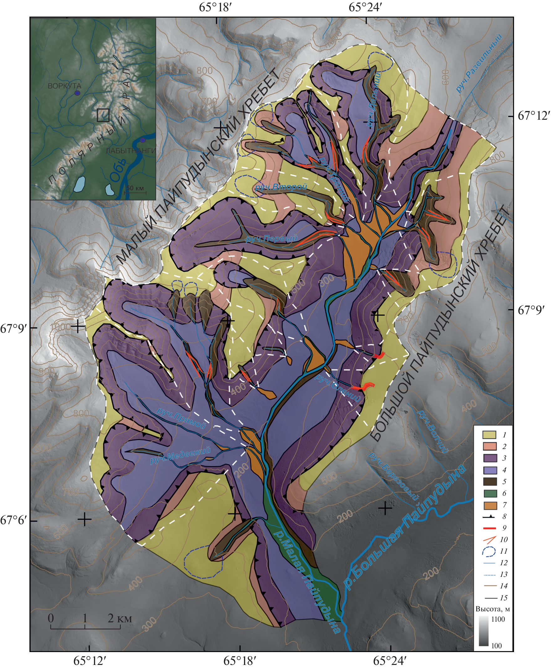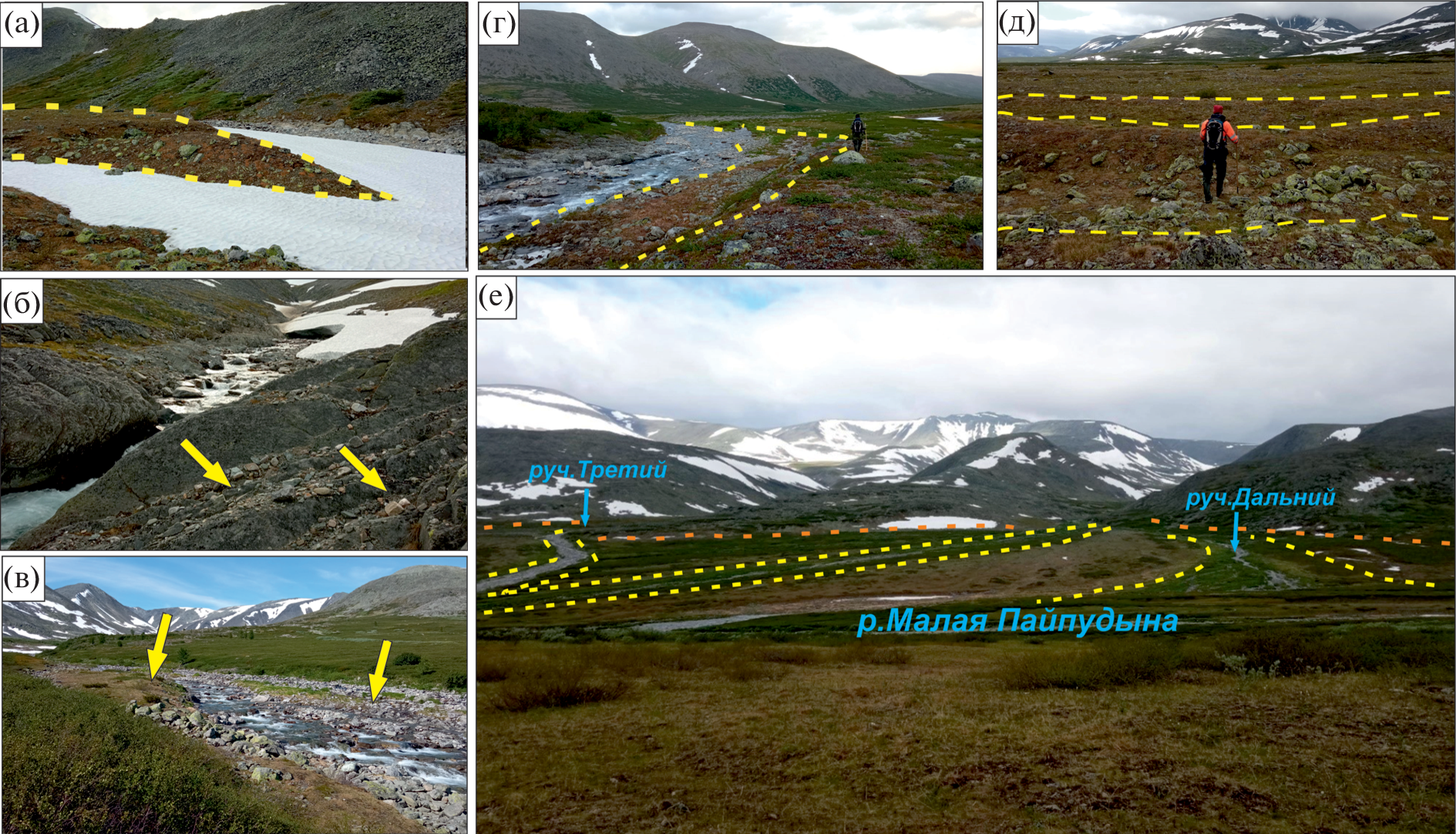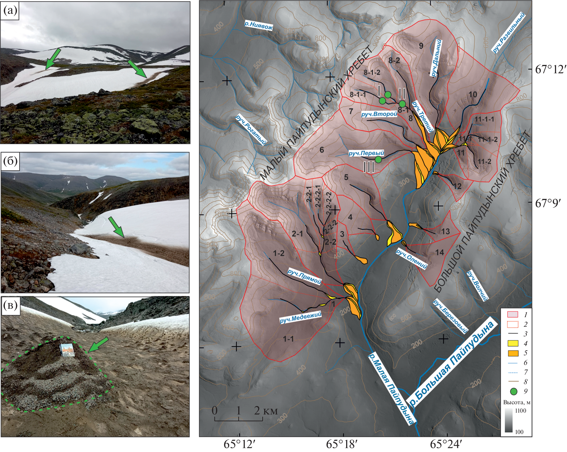 We studied the debris flow relief of the Malaya Paipudyna basin, the Polar Ural Mountains. Based on the analysis of remote sensing data and field surveys, we established that 14 debris flow basins are located on the territory. We found traces of five slushflow occurrence in the streams in the spring of 2021. Typical landforms for different morphodynamic zones of debris flow basins were identified. The initiation zones of debris flows are mainly represented by catchment funnels on the slopes of the Bolshoi and Maliy PaIpudynskii ranges. The transit zones V-shaped bottom incisions alternate with box- and trough-shaped transverse profile. Within the debris flow fans, two generations of accumulative debris flow relief are clearly distinguished. Young accumulation zones are represented by pebble-boulder ridges up to 0.5 m high, localized directly in the near-channel areas of debris flow fans. Usually, they are either devoid of soil and vegetation cover, or are overgrown only by herbs. Ancient debris flow fans are triangular in shaped with convex transverse profile, consisting of a system of ridges and hollows, and overgrown with shrubs. The area of young accumulation zones for each debris flow basin is no more than 0.03 km2, the area of ancient accumulation zones is 0.4 km2. Debris flow fans are superimposed on the bottom of the trough valley of Malaya Paipudyna, which is mainly the surface of glacial accumulation. Probably, the formation of these fans began after the degradation of the last extensive glaciation of the territory. We calculated the morphometric features of the debris flow basins.