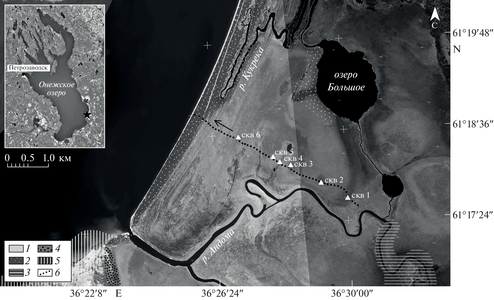 Постледниковая история развития побережья Онежского озера в совокупности с современными процессами создает условия для формирования сложных прибрежных экосистем, которые могут быть уязвимы из-за возможных климатических изменений и антропогенного влияния. К таким системам относятся водно-болотные угодья, протянувшиеся вдоль восточного и южного побережья Онежского озера. Научный интерес представляет территория в районе устья р. Андомы, так как здесь сочетается влияние русловых процессов крупной реки, динамика побережья Онежского озера, а также развитие верховых торфяников. Целью исследований было детальное изучение структуры голоценовых отложений на северном берегу р. Андомы, которая отражает этапы формирования и изменчивость природных условий приозерной низменности. Для этого была проложена опорная трансекта, включающая профиль георадиолокационных наблюдений протяженностью 4800 м, дополненный скважинами. На основе данных георадиолокации в сочетании с исследованием торфа по скважинам получен комплексный разрез, характеризующий внутреннее строение торфяника. Вдоль профиля обнаружены аккумулятивные структуры, такие как погребенные береговые валы и палеодюна. Также установлено платоподобное поднятие коренного ложа болота, обрамленное локальными понижениями. Подобную структуру можно рассматривать как деформацию, связанную с гляциодислокациями или неотектоническим воздействием. Кроме основных структурных элементов найдены локальные эрозионные врезы в кровле лимноаллювия, сопровождающиеся песчаными отложениями, которые могут быть приурочены к погребенным палеоруслам р. Андомы. Анализ комплексной трансекты в совокупности с описанием растительности показал существование зон, отличающихся по биолого-экологическим условиям, которые способствуют биологическому разнообразию в районе работ. В перспективе создание подобных опорных трансектов обеспечивает базу для первичного выявления уязвимостей и долгосрочного мониторинга экологической трансформации экосистем.