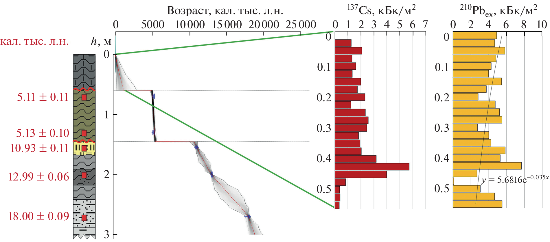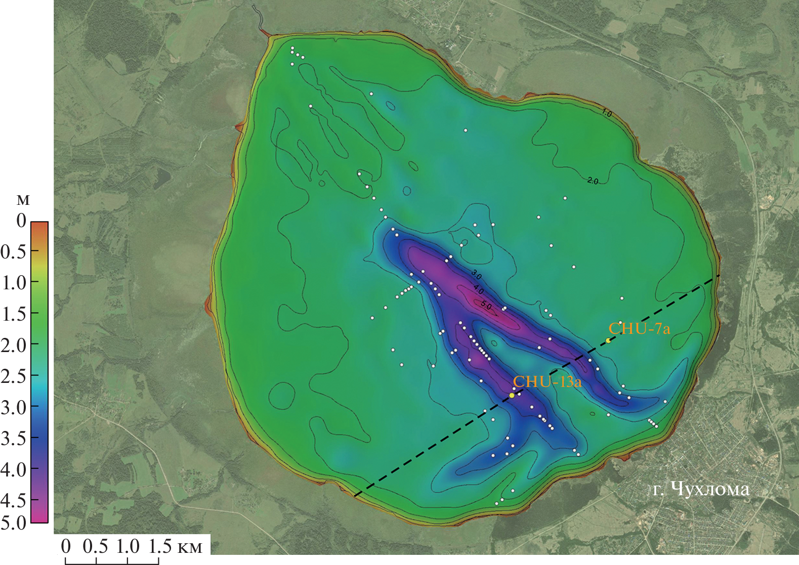 Строение донных отложений Чухломского озера вскрыто бурением со льда двумя скважинами: Chu7A – на участке фоновых глубин (длина керна 9.45 м); и Chu13A – внутри ложбины (длина керна 7.45 м). Для керна Chu13A получено 5 радиоуглеродных AMS дат. Осадочные последовательности доголоценовой части обоих кернов обнаруживают высокое сходство по строению и абсолютным высотам маркирующих горизонтов, выделенных по комплексу литологических анализов. Строение и мощность голоценового осадка существенно различается. На участке фоновых глубин мощность органоминерального ила голоценового возраста составляет 3.8 м, а внутри ложбины мощность этого слоя составляет всего 1.45 м. Причем в строении голоценового осадка внутри ложбины наблюдаются перерывы в осадконакоплении, возраст которых на основании модели осадконакопления оценивается как 10.6–5.3 и 4.9–0.06 кал. тыс. л. н. Вероятным механизмом происхождения ложбин является локализованная эрозия, вызванная ветровыми течениями в условиях крайне мелководного озера. Дополнительным фактором эрозии может выступать дегазация донных отложений, приводящая к разрыхлению придонного слоя осадков, что делает их податливыми для размыва. Прекращение размыва осадка внутри ложбины совпадает по времени с сооружением плотины на реке Вёкса и подъемом уровня озера на 1.0–1.5 м в 1960-х гг.