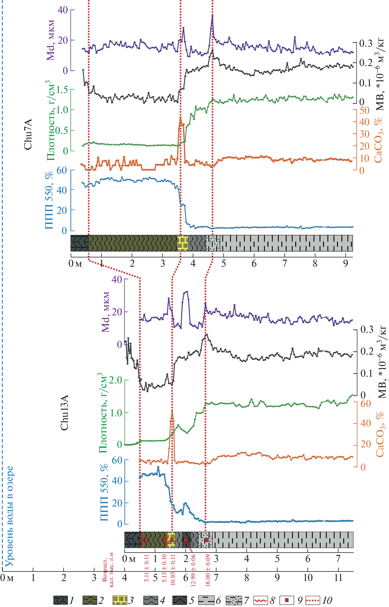 The article discusses the first results of studying the structure of the bottom topography and bottom sediments of Chukhlomskoe Lake (Kostroma Region, Chukhlomsky District). We analyzed the lake bottom topography based on the results of our bathymetric survey and discovered two hollows with maximum depths diverging from the lake’s center towards the city of Chukhloma. The maximum depth inside the hollows (and for the entire lake) reaches 5.4 m, and the average lake depth is 2.2 m. There are two steps seen in the bottom topography; 2.0–2.4 m and 1.5–1.8 m. The bottom sediment structure of Chukhlomskoe Lake was revealed by drilling from the ice with two boreholes (with lengths of 9.45 and 7.45 m, located in the area of background depths and inside the hollow, respectively). Five radiocarbon AMS dates were obtained for the core from the hollow’s bottom. The sedimentary sequences of the pre-Holocene part of both cores show high similarity in structure and depths of the marker horizons identified by a set of lithological analyses. The structure and thickness of Holocene sediments differ significantly. In the area of background depths, the Holocene organo-mineralogenic silt is 3.8 m, and inside the hollow, the thickness of this layer is only 1.45 m. Moreover, hiatuses in sedimentation were documented in the structure of the Holocene sediment inside the hollow. The age of hiatuses, based on the sedimentary model, was estimated as 10.6–5.3 and 4.9–0.06 thousand years ago. A probable mechanism for the origin of hollows is localized erosion caused by wind currents in a highly shallow lake. An additional erosion factor can be the degassing of bottom sediments, which leads to the loosening of the bottom layer of sediments, which makes them susceptible to erosion. The cutoff of sediment erosion inside the hollow coincided in time with the construction of a dam on the Veksa River and a rise in the lake level by 1.0–1.5 m in the 1960s.