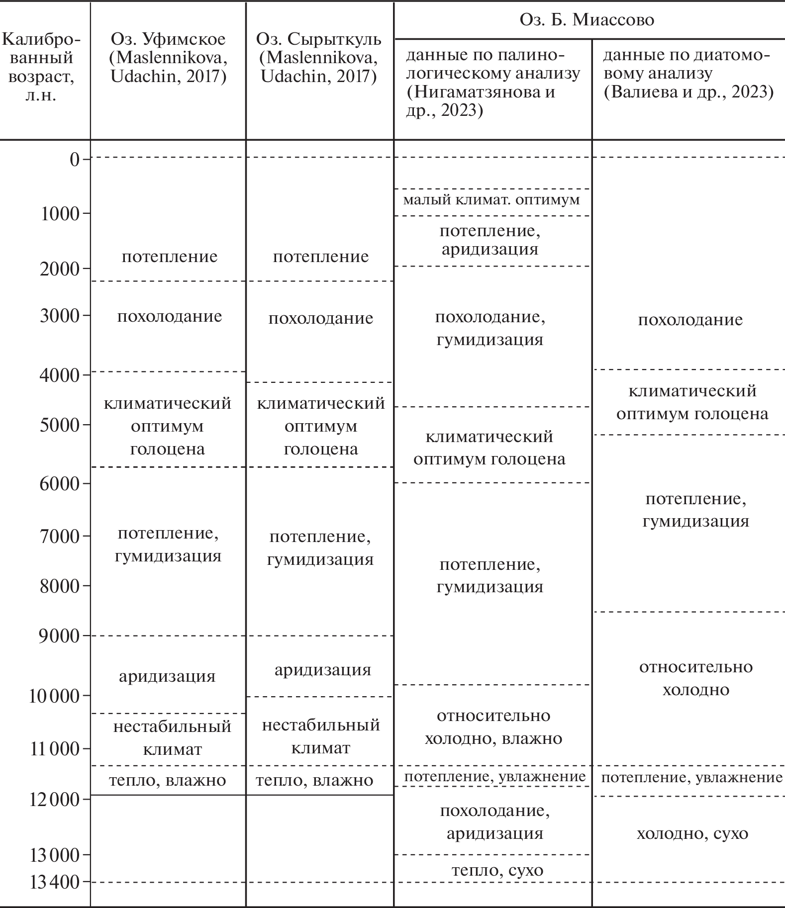 - Maslennikova A.V., Udachin V.N., Aminov P.G. (2016). Lateglacial and Holocene environmental changes in the Southern Urals reflected in palynological, diatom, geochemical records from the Lake Syrytkul sediment. Quat. Int. Vol. 420. Iss. 28. P. 65–75. https://doi.org/10.1016/j.quaint.2015.08.062