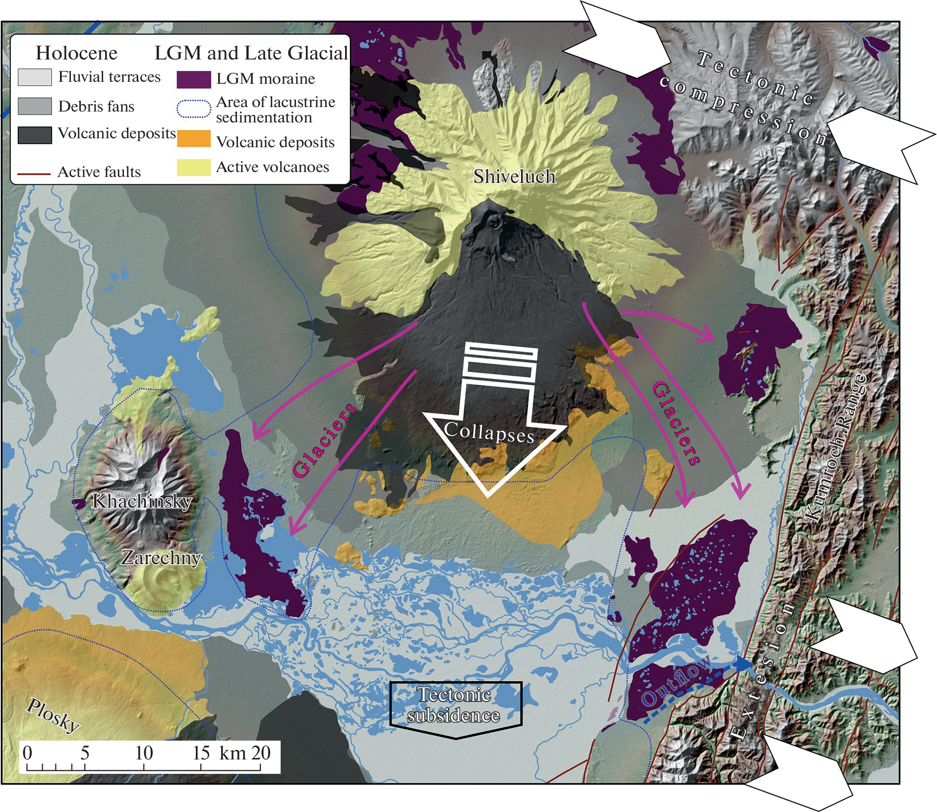 The paper presents a reconstruction of geomorphological processes in the Central Kamchatka Depression (CKD) since 30 ka, including the global LGM time. Major geomorphological processes of this period included the evolution of volcanic edifices accompanied by steady tectonic submergence. Glaciers that originated from volcanic edifices were greatly affected by both climatic forcing and the eruptive history of their host volcanoes.
