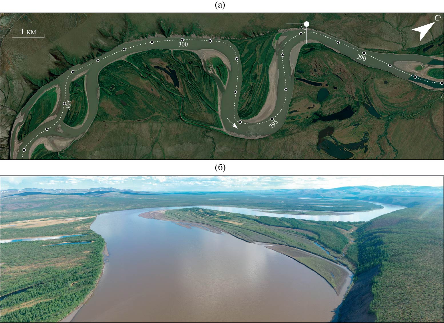 Шивера расположена в вершине крутой излучины, подходящей к правому борту днища долины (рис. 1). Параметры излучины составляют: радиус кривизны в привершинной части r = 800 м, шаг L = 2 км, степень развитости l/L = 3.4 (здесь l — длина русла по излучине). Вследствие наличия шиверы в нарушение нормального для меандрирующего русла руслового рельефа линия наибольших глубин и динамическая ось потока прижаты к левому берегу, а к вогнутости правого берега приурочены выходы скал, грядообразная поверхность которых постепенно повышается к берегу, и у подножья террасы ее высота достигает 1.5 м над урезом (в низкую межень). Под левым выпуклым берегом глубина русла — до 3 м, из-за стеснения скалами его ширина в межень уменьшается до 70 м. Скорости потока по длине порожистого участка — не менее 2.2 м/с, максимальные наблюдаются на спаде половодья (паводков) — до 3.2 м/с в среднем по сечению и 4 м/с — на стрежне.