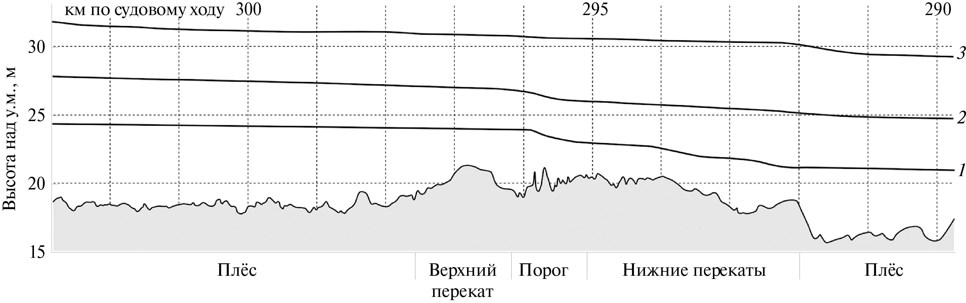 Рис. 3. Рельеф дна русла р. Яны в пределах внутригорной впадины, его макроформы и продольные профили водной поверхности при различных расходах воды: 1 — при проектном уровне (920 м3/с), 2 — во время полевых исследований (4340 м3/с), 3 — при руслонаполняющем (12 000 м3/с).