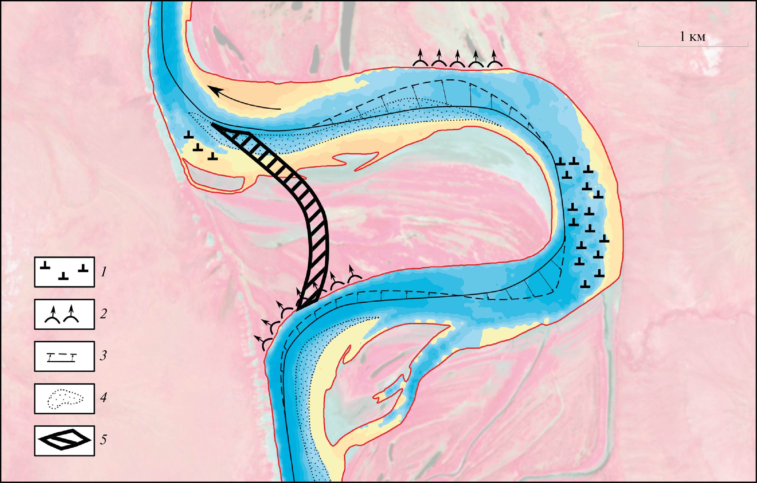 Рис. 4. Прогнозная оценка переформирований русла: 1 — скальные выходы в потоке; 2 — развитие вогнутости размываемого берега, оказывающее направляющее воздействие на поток; 3 — изменение положения динамической оси потока; 4 — зоны аккумуляции наносов; 5 – гидравлически оптимальное положение оси потока при спрямлении излучины и рекомендуемая прорезь-канал через шпору излучины.