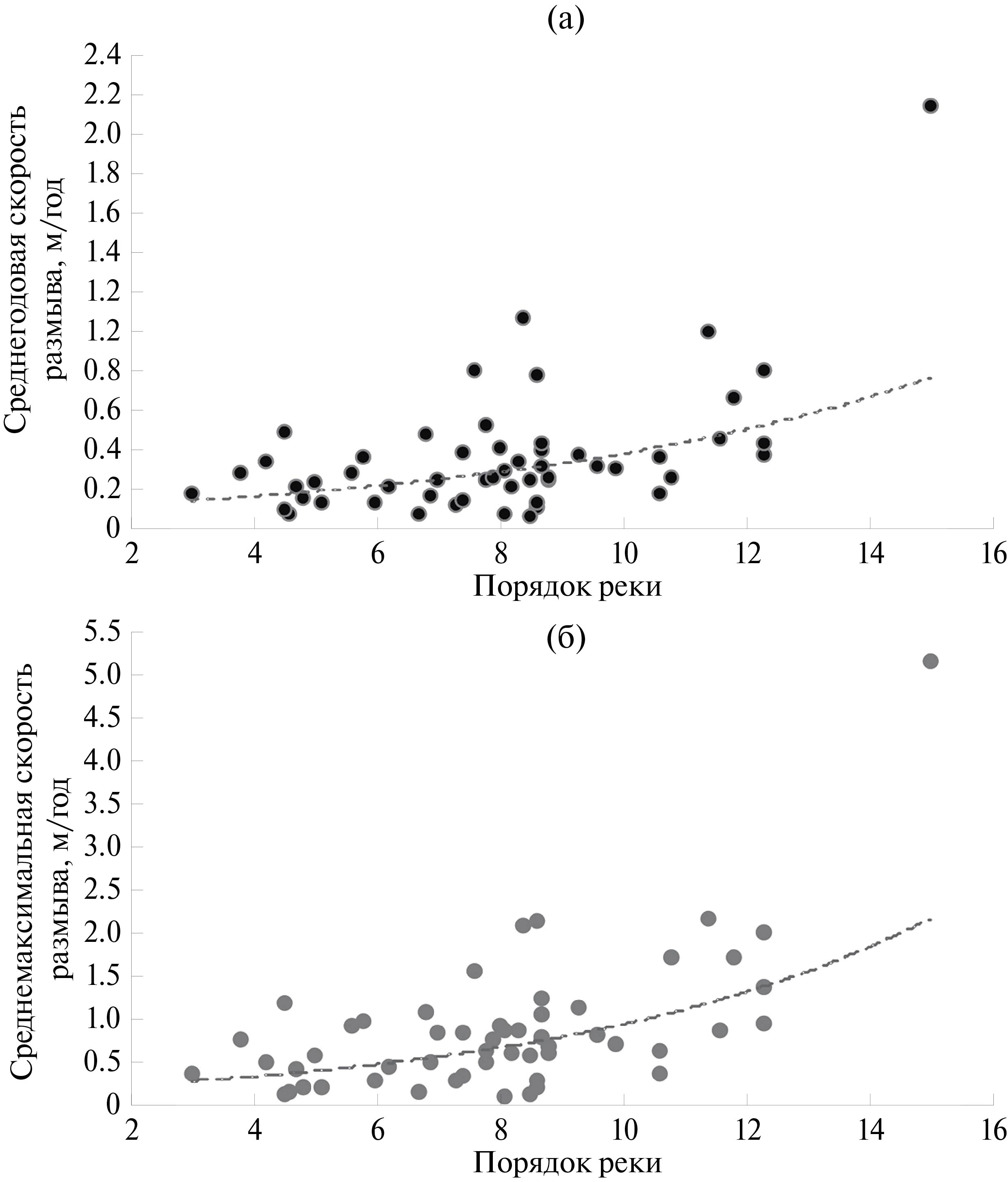 Рис. 2. Зависимость среднегодовых (а) и среднемаксимальных (б) скоростей размыва от порядка реки на территории Удмуртии за период 2000–2022 гг.