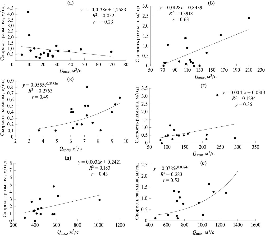 Рис. 5. Графики зависимости максимальных скоростей размыва от максимальных расходов на р. Адамка (с. Грахово) (а), максимальных скоростей размыва от максимальных расходов на р. Лоза (п. Игра) (б), среднегодовых скоростей размыва от среднегодовых расходов на р. Нылга (с. Нылга) (в), максимальных скоростей размыва от максимальных расходов на р. Сива (с. Гавриловка) (г), максимальных скоростей размыва от максимальных расходов на р. Чепца (д. Каменное Заделье) (д) и среднегодовых скоростей размыва от максимальных расходов на р. Чепца (д. Дизьмино) (е).