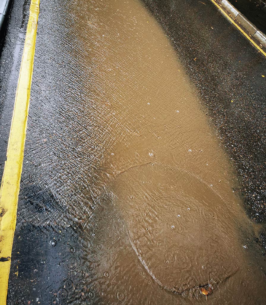 Рис. 1. Песчано-глинистый шлейф на проезжей части во время обложного дождя — проявление активного твердого стока с городской территории. Фото В. А. Неходцева.