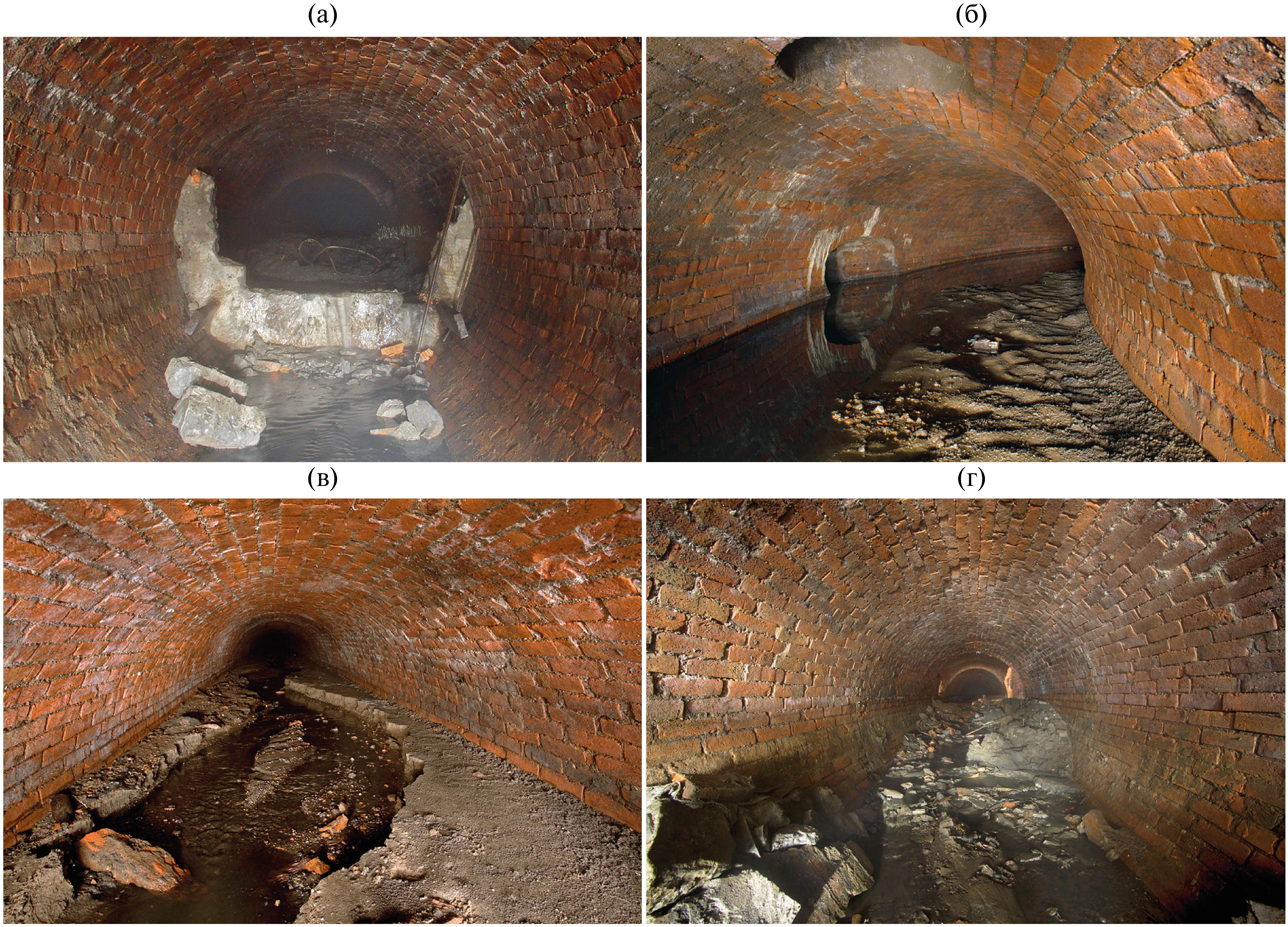 В одном из обследованных коллекторов 1908 г. постройки, проложенном вдоль Калитниковского пруда (Таганский р-н, ЦАО), была обнаружена крупная толща наносов. В 2005 г. (по сообщению пресс-службы ГУП “Мосводосток”) коллектор Калитниковского ручья был перегорожен бетонной плотиной высотой около 1.6 м (рис. 2) для проведения строительных работ; в январе 2011 г. перегородка была демонтирована. За это время за плотиной накопилась мощная песчано-глинистая толща с включением кирпичей и валунов, которая была нами обследована и зафиксирована. Такие отложения “подземных рек” и ливнестоков было предложено называть техноаллювием (Неходцев, 2012). На снимках (см. рис. 2, (а)) видно, что грунт не сравнялся по высоте с перегородкой и, следовательно, на протяжении 6 лет продолжал накапливаться вплоть до демонтажных работ.