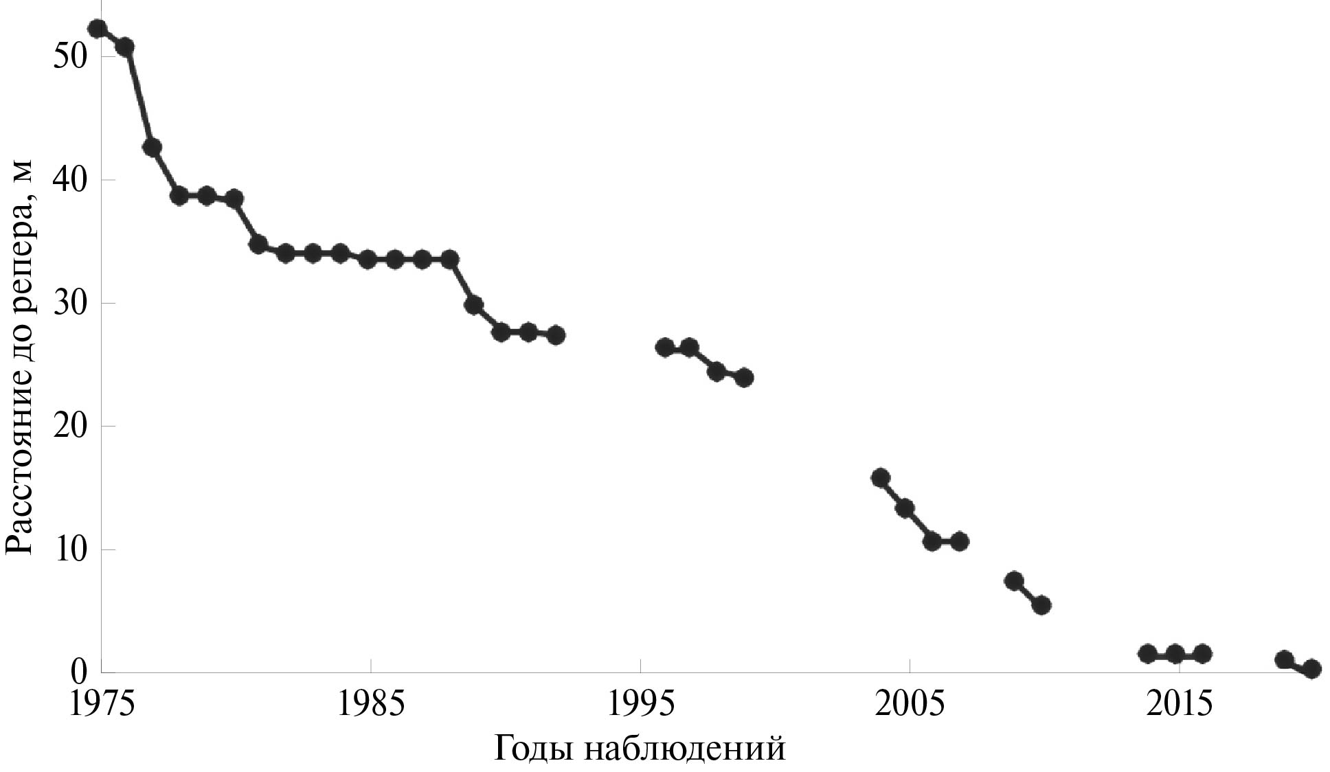 C 1975 по 1992 г. наблюдения проводились на 19 створах, расстояние между ними 140 м; в качестве реперов использовались столбы линии электропередачи. За это время средняя скорость отступания клифа составила 1.1 м/год, максимальная — 2.2 м/год. Часть реперов в 90-е гг. ХХ в. была уничтожена, к 2020 г. остался только один репер, полученный на нем ряд приведен на рис. 2.
