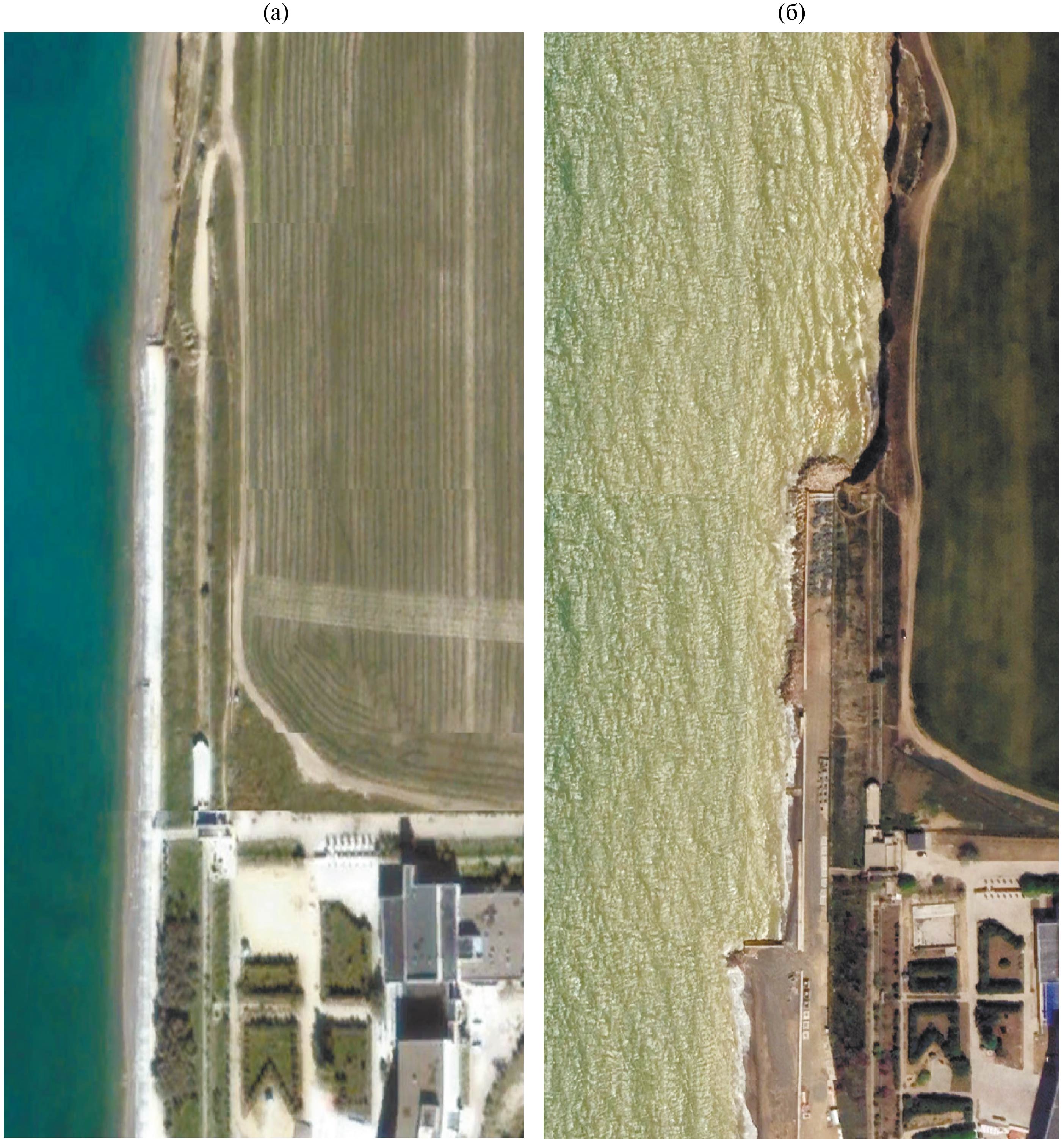 Рис. 4. Спутниковые снимки района набережной с. Берегового: (а) — октябрь 2004 г., (б) — май 2021 г.