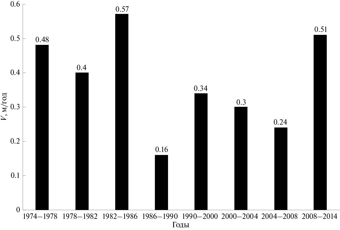 Рис. 5. Межгодовая изменчивость скорости отступания бровки клифа на участке № 5.