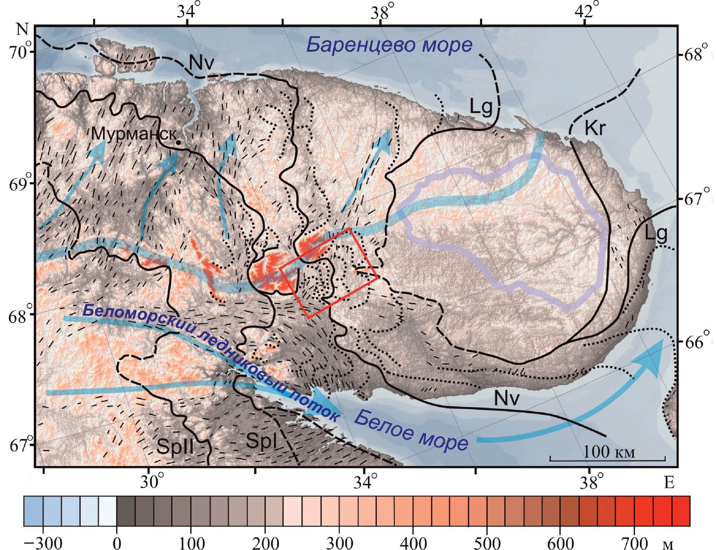 Рис. 1. Положение района работ в Кольском регионе. Линиями показаны границы последнего ледникового покрова во время фаз: Kr — крестецкой, Lg — лужской (Кейва I, карельская), Nv — невской (Кейва II, сямо- зерская), SpI, SpII, — Салпаусселька I и II, составлено с использованием (Astakhov et al, 2016; Korsakova et al, 2023). Пунктирная линия — предполагаемая граница. Прозрачная голубая линия — северная граница Беломорского ледникового потока. Прозрачные голубые стрелки — направления движения Скандинавского ледникового покрова (по Евзеров, Николаева, 2000; Boyes et al., 2022). Черные короткие линии - друмлины и линейно ориентированные выступы кристаллических пород по (Государственная ..., 2012; Boyes et al., 2021b). Прозрачный фиолетовый контур — площадь без ледниковых отложений в центре Кольского п-ова (по Дедков и др., 1989; Niemela et al., 1993; Государственная ..., 2012).
