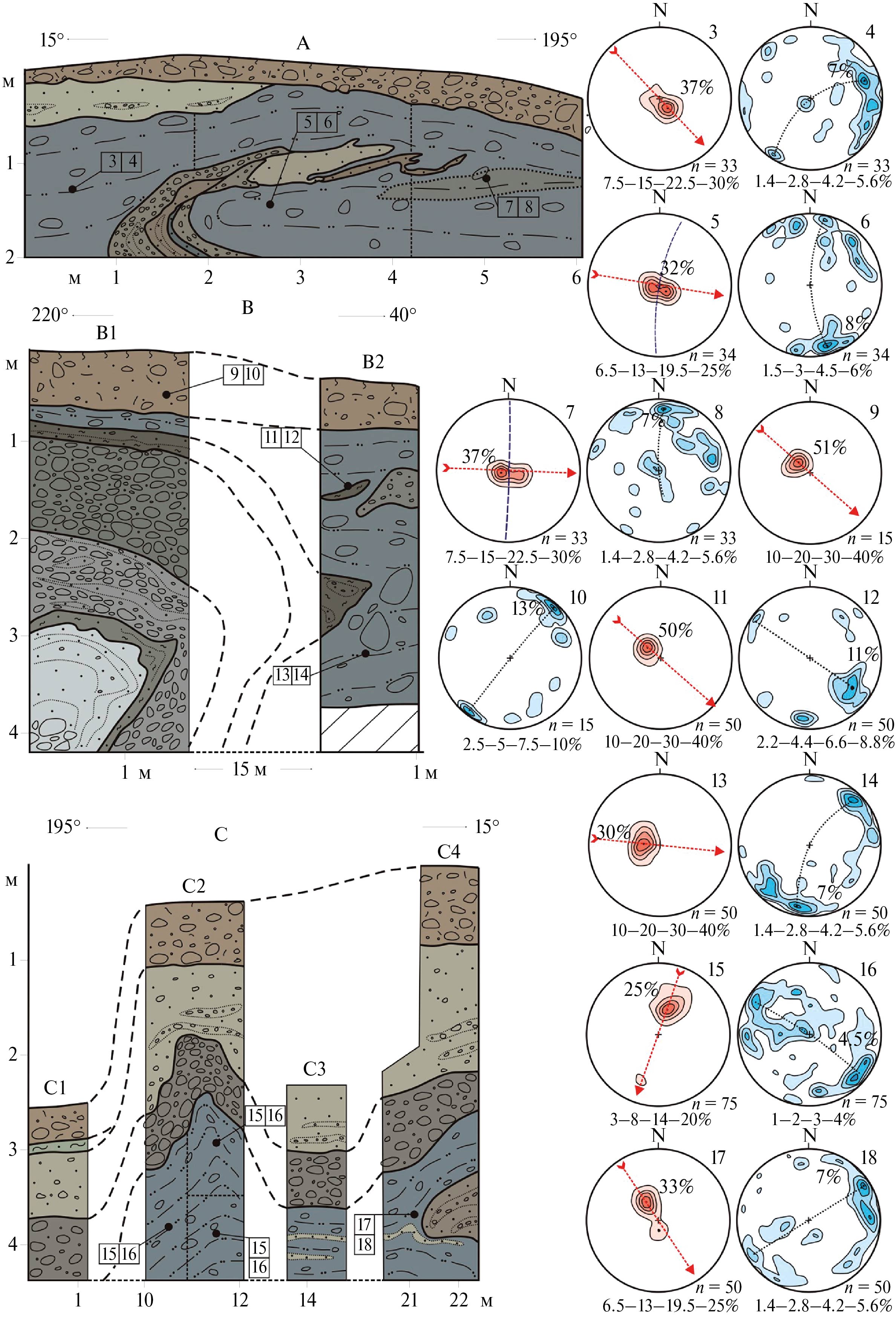 Цепочка холмисто-грядового рельефа на северо-западном склоне Панских Тундр состоит из овальных в плане гряд с асимметричными склонами. На гребне одной из гряд с абсолютной отметкой вершины до 196.7 м над у. м. (N 67°32′44′′, E 35°15′49′′, 5 на рис. 2), вскрываются отложения, разделенные разрывными нарушениями (рис. 3, В1). Выделяются две системы нарушений: пологие надвиги с амплитудой смещения свыше 2.5 м и сколы амплитудой смещения от 1–2 см до 10 см. Падение полюсов плоскостей надвигов установлено в двух направлениях — по азимутам 45° и 260°. Для небольших сколов преобладает направление падения по азимуту 265° (рис. 3, диаграмма 2). В составе дислоцированных блоков отложений наблюдается переслаивание песков т. з. и м. з., однородных, уплотненных, оливково-серого цвета с песками м. з. серо-коричневыми и песками с. з. и к. з., светло-оливково-коричневого цвета с примесью гравия и редкой гальки. Первичная слоистость отложений либо субгоризонтальная, либо имеет выдержанное субпараллельное косое падение. Мощность дислоцированных блоков отложений от 0.85 до 2.3 м и более. В 0.17 км к северо-востоку в строении гряды отмечается нарушенное залегание алевритов и песков, толща которых падает по азимутам 188–202° и под углами 22–29° (рис. 3, В2).