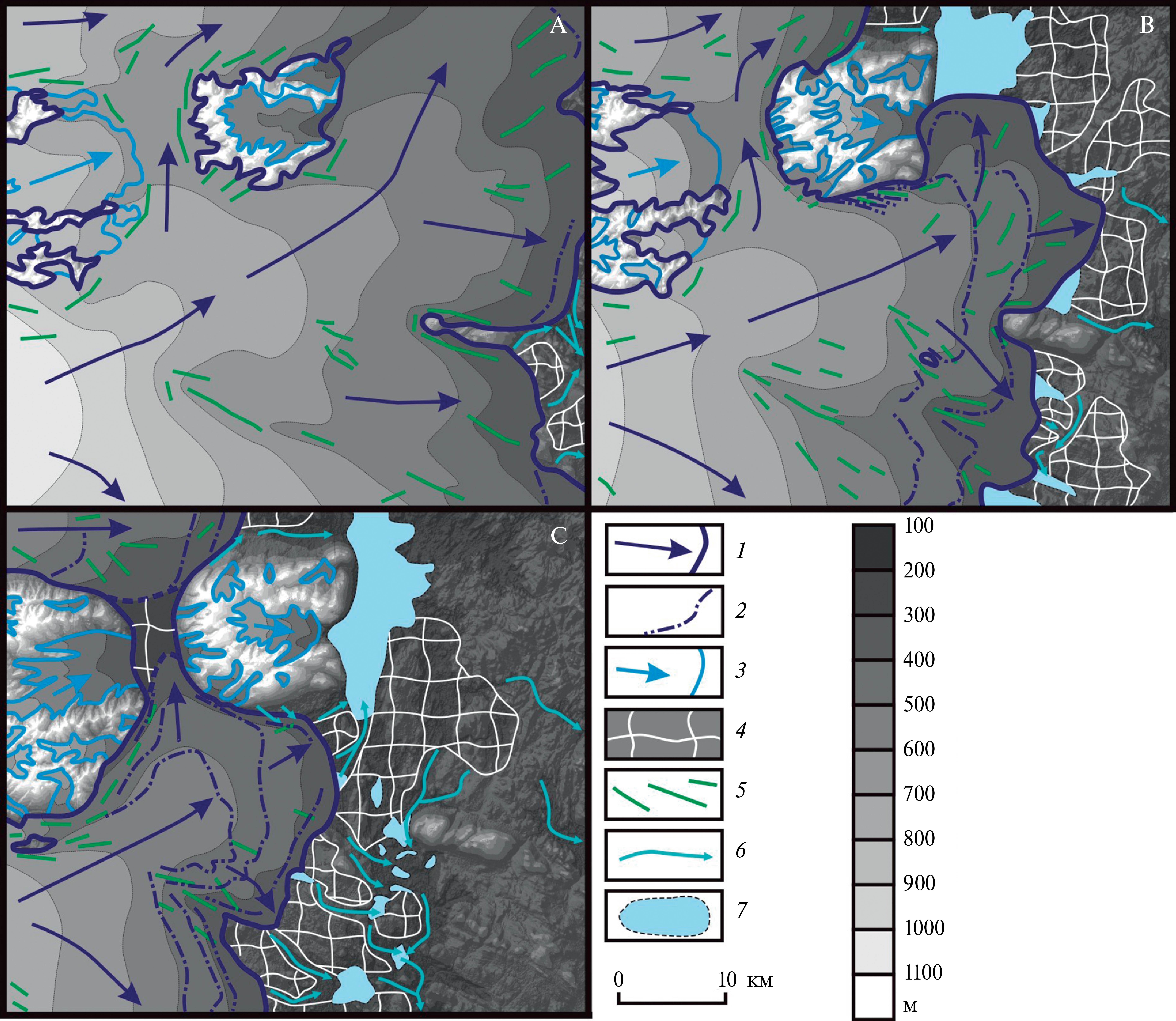 Рис. 6. Схема основных этапов сокращения последнего ледникового покрова в центральной части Кольского региона: А — начальный этап лужской фазы (15700–15000 кал. л. н.), В — завершающий этап лужской фазы (15 000–14 700 кал. л. н.), С — этап невской фазы (14100–13900 кал. л. н.).