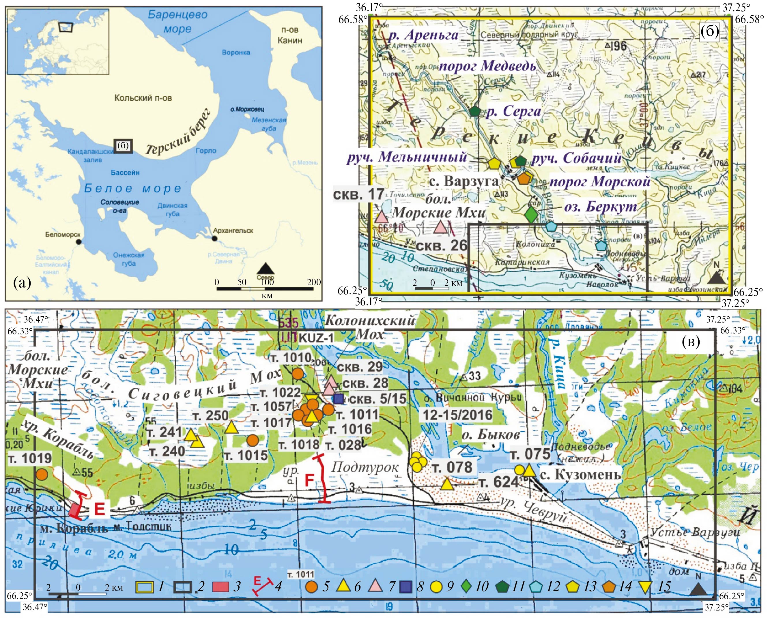 Участки: 1 — регионального морфотектонического анализа и выделения древних береговых линий по данным дистанционного зондирования, 2 — полевых работ, детального морфотектонического и морфолитодинамического картографирования; 3 — съемки беспилотным летательным аппаратом (БПЛА); 4 — линии профилей тригонометрического нивелирования и их номера; положение разрезов и скважин и их номера: 5 — данная работа, 6 – (Зарецкая, Репкина, 2015), 7 — (Елина и др., 2005), 8 — (Агафонова и др., 2020), 9 — (Репкина и др., 2022), 10 — (Ilyashuk et al., 2005), 11–12 — (Кошечкин и др., 1973): разрезы позднеледниковых и раннеголоценовых отложений (11 — ленточные и ленточноподобные глины, 12 — пески, супеси, глины), 13 — (Lunkka et al., 2018), 14 — (Korsakova et al., 2019; Zaretskaya et al., 2022), 15 — (Тимирева и др., 2022). Географическая основа: (a) — (White Sea …, 2022), (б, в) — (ЭтоМесто…, 2022).