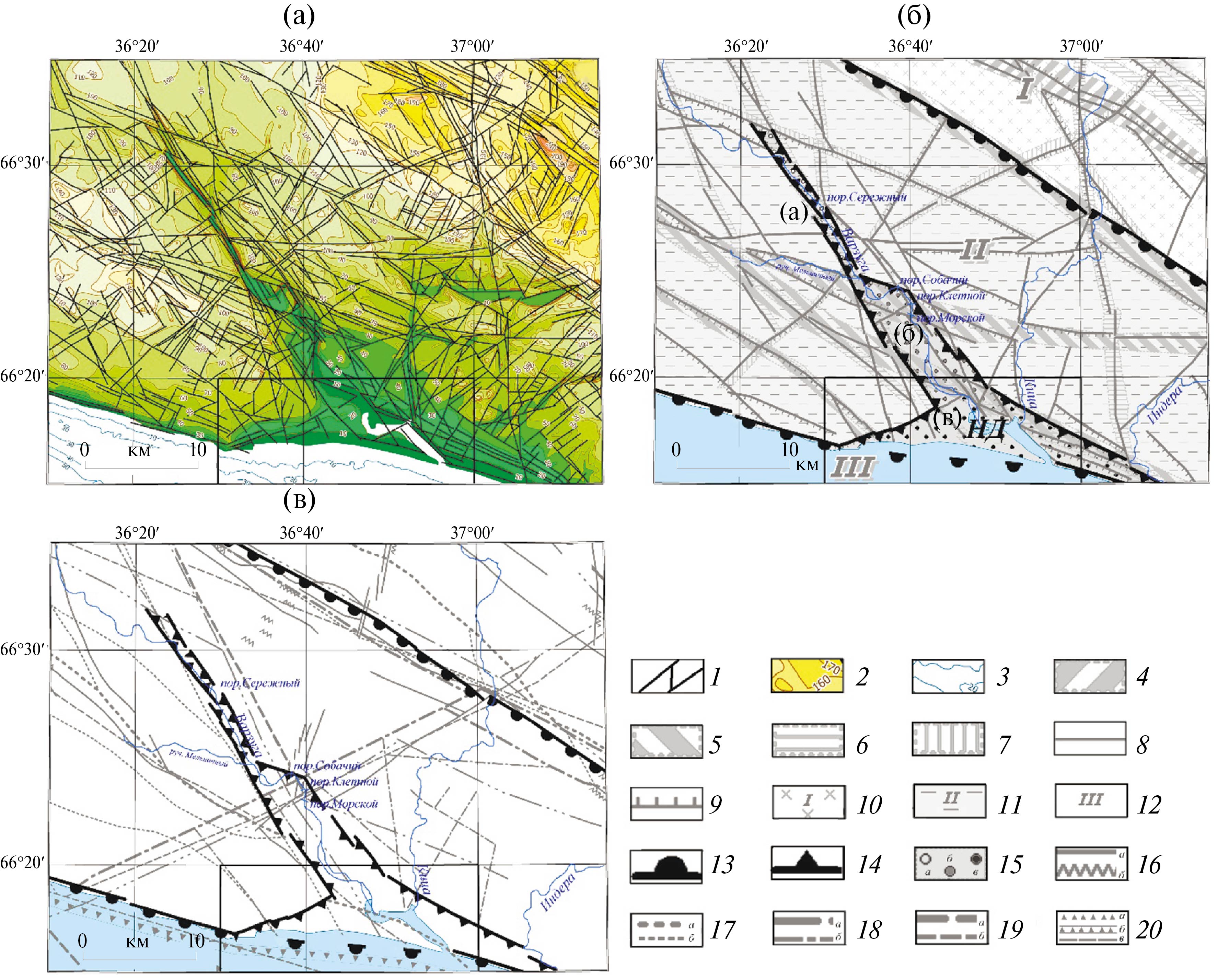 Методика морфотектонического анализа опирается на известные принципы тектонической геоморфологии — отражения тектонических структур в рельефе и соответствия форм рельефа новейшей тектонической активности (Флоренсов, 1978; Уфимцев, 1984; Doornkamp, 1986; Scheidegger, 2004 и др.), а также модели дискретной иерархической структурированности литосферы в виде жестких блоков, окруженных зонами пониженной вязкости (дробления) (Красный, 1984; Садовский и др., 1987). Методика включает две составляющие: морфолинеаментный анализ — выявление новейших тектонических нарушений, выраженных в современном рельефе, и морфоструктурное районирование — иерархическое разделение линейных и площадных структур (блоков и межблоковых зон). Морфологически выраженные нарушения, образующие блоковую структуру региона (Шварев, 2022), допустимо отнести к потенциально активным в неоплейстоцене, который на Кольском полуострове считается последним этапом тектонических деформаций (Колодяжный и др., 2019).