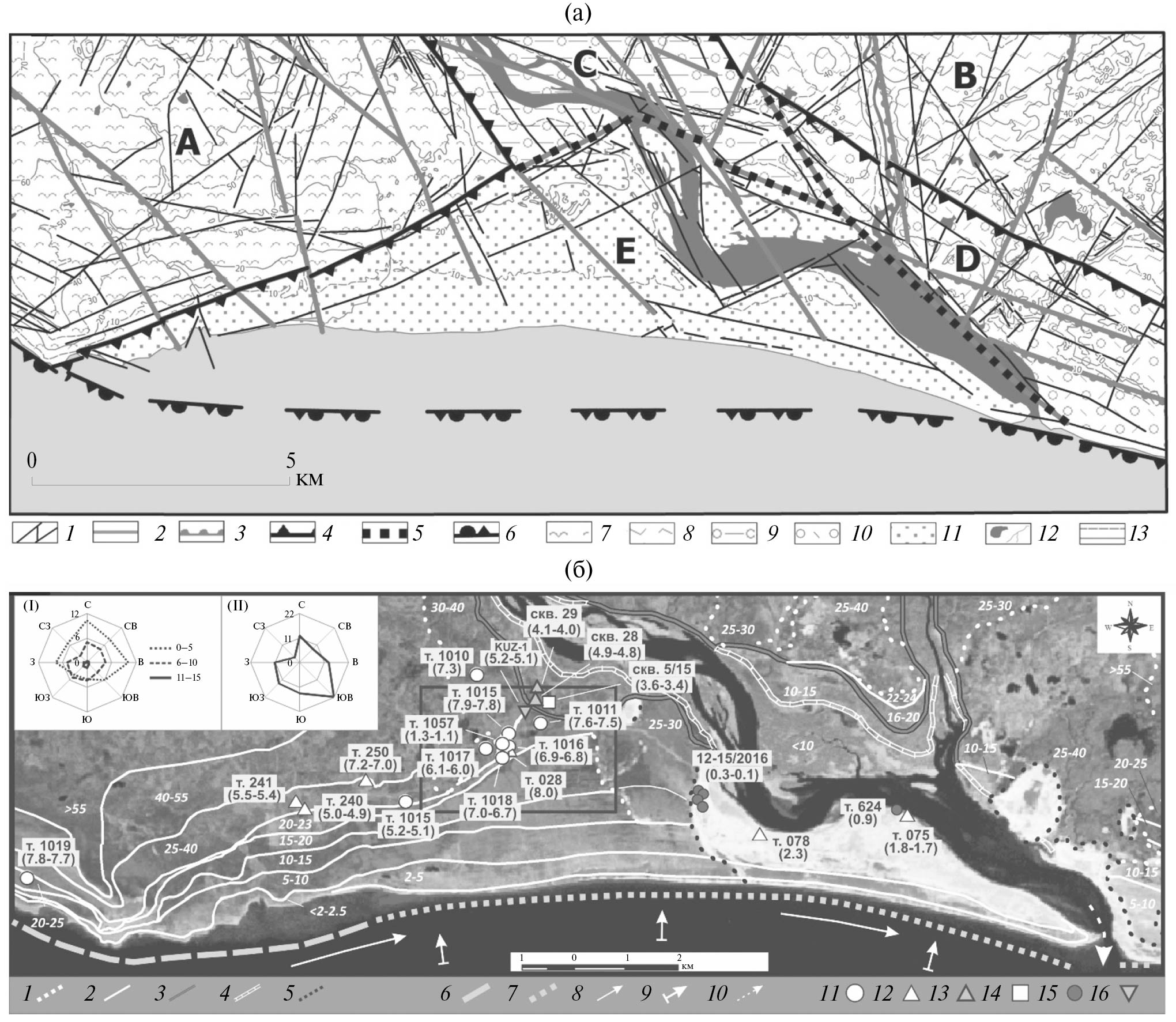 Вместе с тем, единое мнение о морфодинамике и факторах развития береговой зоны района в позднеледниковье и голоцене пока не сформировалось. Дискуссионными остаются высота, положение, возраст, обстановка формирования древних береговых линий, представление об изменении ОУМ и скорости вертикальных движений. В частности, “верхнюю морскую границу”, выше которой ОУМ не поднимался, выделяют на высотах 39–40 (Корсакова, 2022), 50–55 (Кошечкин и др., 1973; Зарецкая, Репкина, 2015) или 65 м над у. м. (Тимирева и др., 2022), а генезис и возраст террас и террасовидных поверхностей на высотах 20–40 м над у. м. по-прежнему могут быть интерпретированы неоднозначно (Зарецкая, Репкина, 2015; Агафонова и др., 2020; Тимирева и др., 2022). Не одинаковы также представления о границах и кинематике морфоструктурных блоков как на Терском берегу в целом (Кошечкин, 1979; Авенариус, 2004), так и в устье р. Варзуги в частности (Невесский и др., 1977; Зарецкая, Репкина, 2015). Причина этого — сложный рельеф, сформировавшийся на границе суши и моря. Поэтому для реконструкции процессов прошлого необходимы детальные, в том числе инструментальные, данные о планово-высотном положении форм рельефа разного генезиса, пополнение массива хронологических и аналитических данных, а также совместный анализ структурных и скульптурных форм рельефа морского побережья и нижнего течения реки.