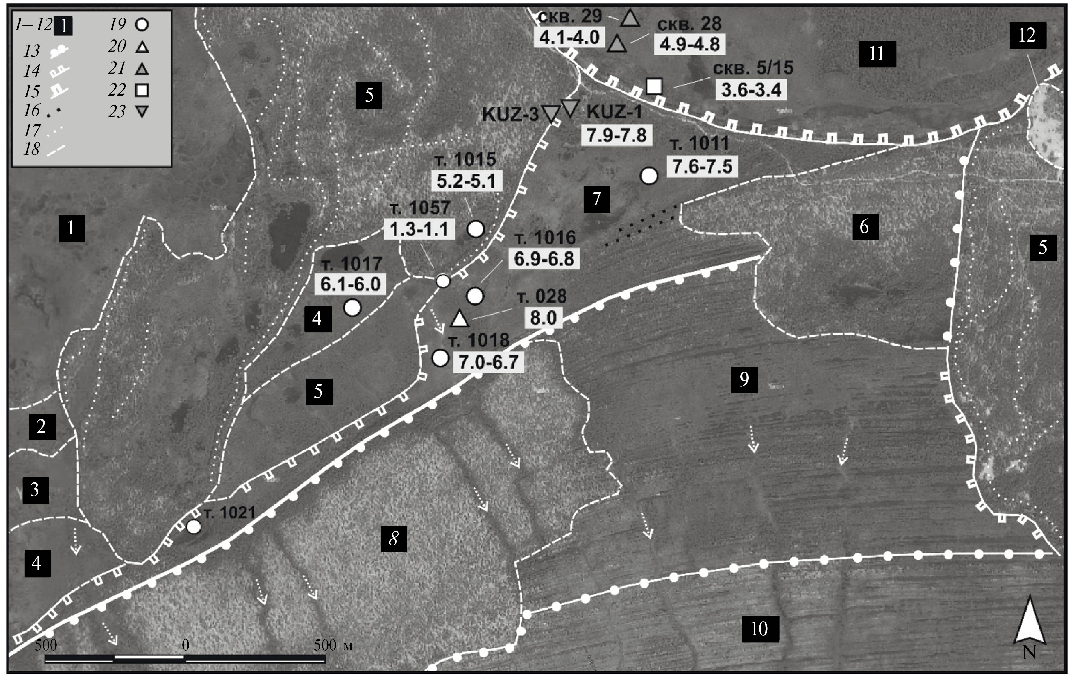 Морфолинеаментное поле, как закономерное сочетание иерархически сопряженных линеаментов и их зон, выраженных в современном рельефе, выявлено путем совместного дешифрирования космических снимков (КС) Landsat-ETM+ с пространственным разрешением 15–30 м и цифровой модели рельефа (ЦМР) Arctic DEM с пространственным разрешением 2–10 м и вертикальной точностью 2 м. Это обеспечило распознавание элементарных морфолинеаментов протяженностью более 1 км и шириной первые метры–десятки метров. Для исключения прямолинейных форм эрозионного рельефа, которые могут маскировать тектонические, по топографическим картам среднего масштаба согласно традиционной методике (Симонов, Лукашов, 1963; Шубина, Аристархова, 1965) построены морфоизогипсы с сечением 10–20 м.