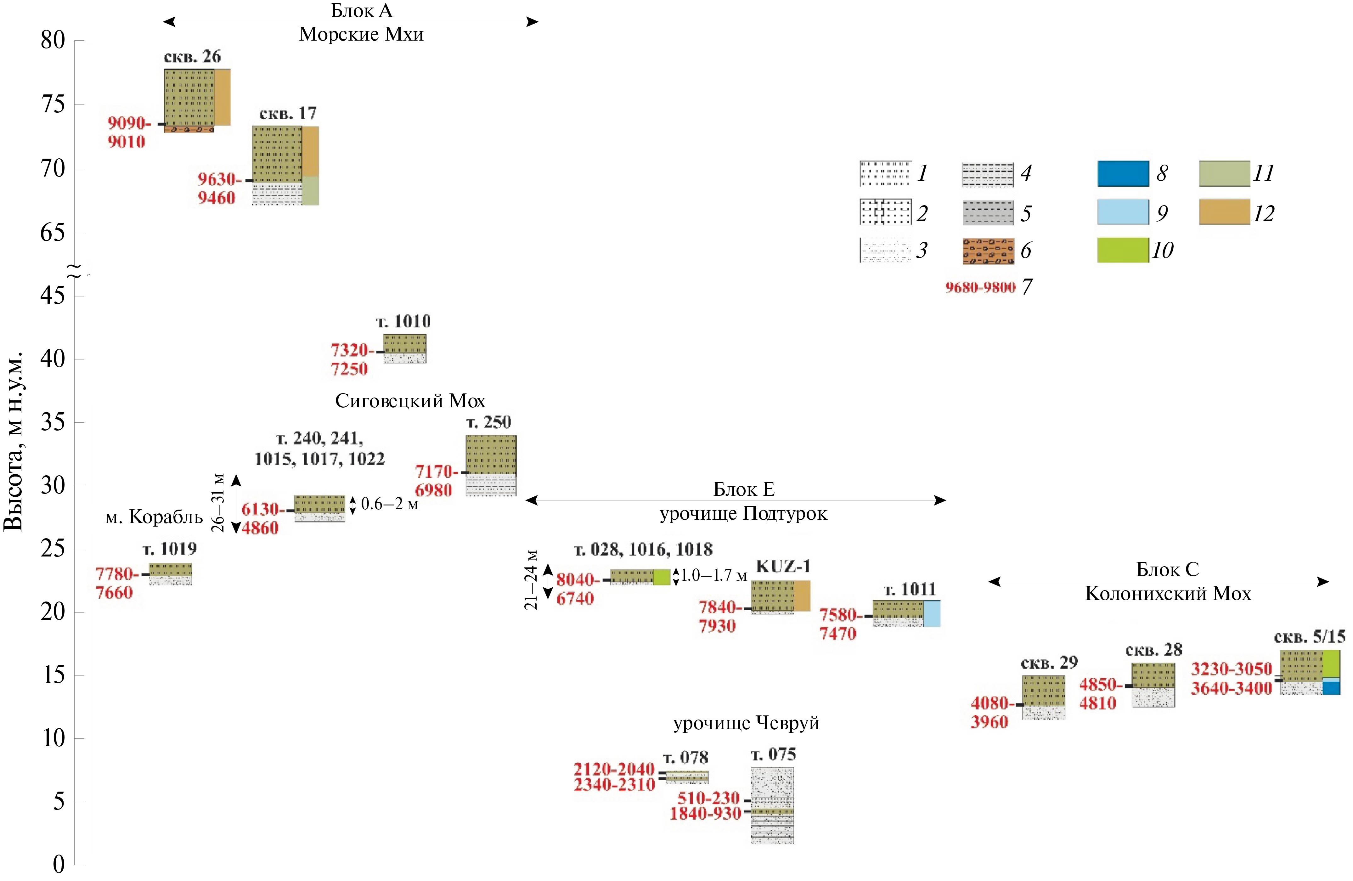 При реконструкции изменения ОУМ использован подход (van de Plassche, 1995; Hijma et al., 2015; Dusterhus et al., 2016). Он предполагает оценку положения (высоты) индикаторов ОУМ — отложений и форм рельефа, сформировавшихся в береговой зоне, а также выше или ниже нее, относительно среднего уровня моря. В условиях значительных колебаний уровня разной природы, характерных для открытого побережья и эстуария р. Варзуги (Гидрометеорология ..., 1991; Крыленко и др., 2018), это позволило сравнить информацию, полученную из разных архивов. На основании аналитических исследований и/или литологии, датированные образцы отложений были разделены на две группы: накопившиеся в зоне регулярных и экстремальных колебаний уровня (лагунные и эстуарные) и выше нее (озерно-болотные и эоловые). Высота древних береговых линий и террас определялась, согласно (Каплин, Селиванов, 1999): абразионных — по тыловому шву, а аккумулятивных — по мористому береговому валу. Интервал высот, в котором могли образоваться формы и отложения разных генетических типов, определялся по данным о соотношении современных колебаний уровня и строения береговой зоны. Полученные данные об изменении ОУМ в пределах разных блоков использованы для оценки скорости их вертикальных движений.